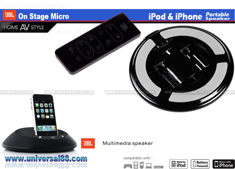 原廠保用一年 iPod & i Phone 音樂播放 JBL專為蘋果APPLE iPod及iPhone而設的高品質手提揚聲器 2 枚Odyssey 釹合金單元揚聲器, 廣闊的全頻率音效輸出 (Neodymium magnet Speakers) 功率 輸出: 3Watts x 2 RMS 支援各類iPod 或 iPhone 的docking插座 乾濕電兩用, 使用 4 枚AAA 型電池在正常使用下可連續 播放約10 小時 iPhone 或 iPhone 充電功能, 外出時盈可為您"蘋果"充電 擴音器 Class D Digital Amplifier 3.5mm 身歷聲插頭, 可連接不同類型音響設備, 適合家庭 電腦、手提電腦、iPod、MP3機及遊戲機使用等等.... 超薄遙控器, 操控聲量、歌曲選擇及瀏覽iPod & iPhone等等.. 手提式乾電池長時間戶外操作或於室內長時間使用電 支援各類iPod or iPhone 3G / iPhone 3GS & iPhone 4 插座 尺寸: 圓周Φ150 / H39.6 mm 電池: AAA x 4 電壓: 110~240V 重量: 500 g 隨機附有一套 iPod Universal Dock for iPhone or iPod 實物寫真 (01) (02) 售價不包括iPod* 詳細資料PDF 由即日起到本店購買此型號之產品, 即可免費獲贈TUNEWEAR iPhone 4 保護貼, 價值$79.-