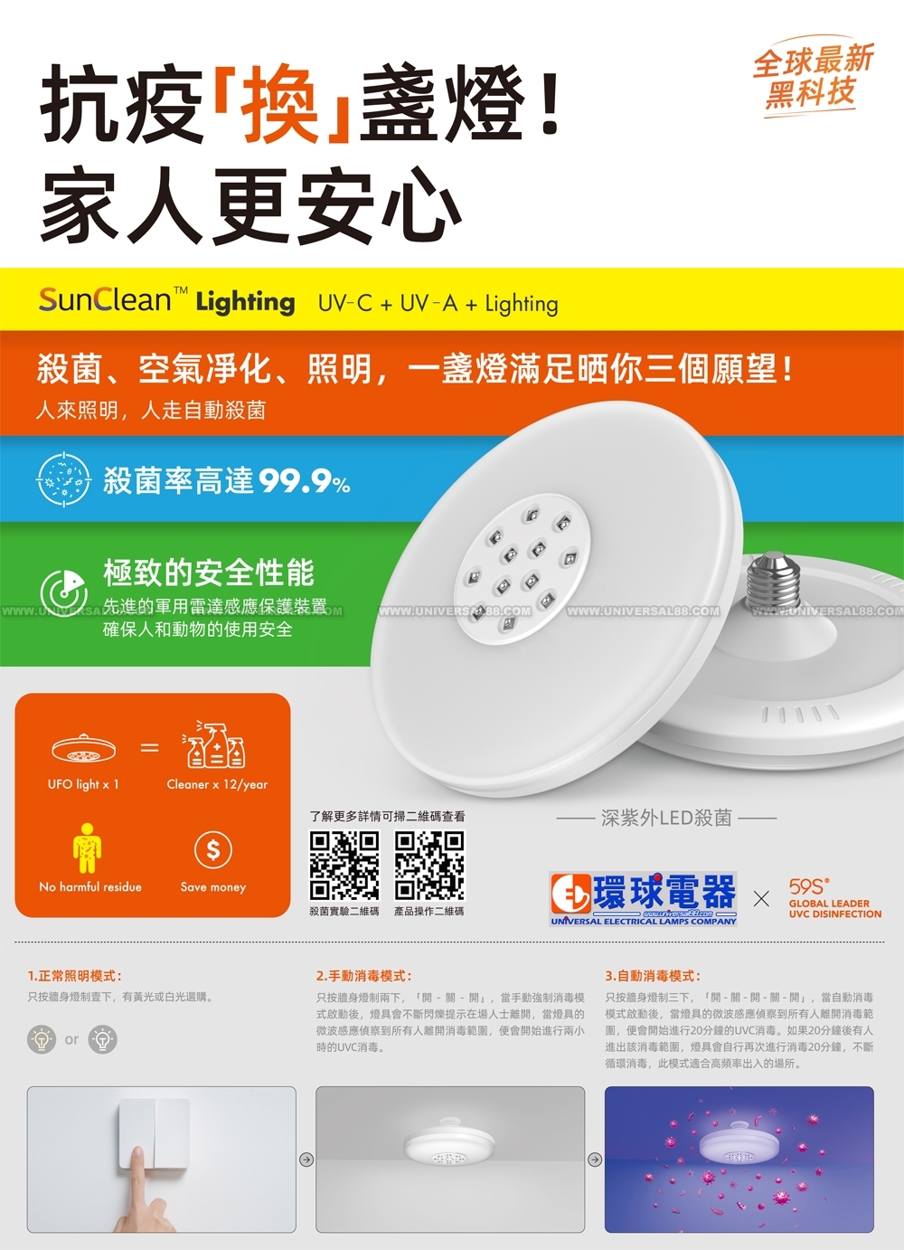(人來照明,人走自動殺菌) (無化學物質/無汞/無臭氧) (軍用雷達感應保護裝置) (UV-C+UV-A 殺菌消毒) (殺死99.9%細菌 / 3in1) (UV燈能產生臭氧雙重殺菌) LASTUPDATE: 22-10-2025