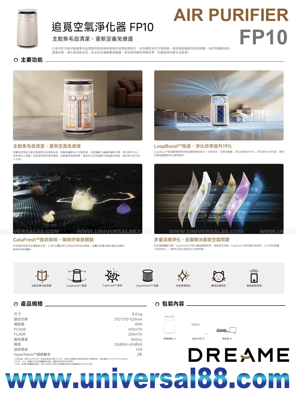 特點: 首創動輥集毛自清潔CataFresh, UVC+負離子 原廠一年保用 追覓 DREAME FP10 主動集毛寵物空氣清新機 首創動輥集毛自清潔CataFresh 除異味甲醛去除率98.3% 濾網等級: H14 HEPA濾網 UVC+負離子 全球首創主動式動輥集毛自清潔: 初效濾網免維護, 長效淨化不衰減 0.46L大容量: 可視化集毛, 99.5% 集毛率, 99.99%除菌率, 99.98%除病毒率 集毛倉毛滿自動提醒, 輕鬆倒毛 CataFresh™ 除味配方: 去除多種異味分子, 空氣更清新 高效除醛結構: 甲醛去除率98.3%, 打造潔淨呼吸空間 LoopBoost™ 風道: 淨化效率 5.8m³/min 初毛濾網免維護: 無需定時清潔/更換初效過濾網零售消耗品, 過濾網乾淨時, 舒適生活唔會整污糟手 六重過滤深層淨化: 99.97% 高效捕捉 PM0.3等微小顆粒, 過敏原, UVC 高效抑菌 智能淨化, 感應呵護: App遠程操控, 四重感應器監測, 環境空氣一見了然 即時顯示空氣質量 濾網生命週期計時提醒 淨化定時功能 語音智慧互動: 全面兼容Google, Alexa智慧生態, 真正實現雙手解放, 語音互動體驗 智慧靜音運行: 睡眠模式噪音低至32dB, 輕音運行, 無感深睡 可選購寵物磅托盤:* 最大承重15KG, 智慧記錄多隻寵物體重, 作息時間資訊生成檔案, 關注毛孩每一刻成長 防傾側設計: 專為活潑寵物而成, 底座更穩唔易倒 低壓電源線 防咬電源線 防訣按兒童鎖 傾倒自動馴繼電 環形環境光: 色溫隨環境空氣質量動態變化, 環境質量一目了然 Dreame FP10 Air Purifier World's Forst Roller Self-cleaning Air Purifier Powerful Collection, Lasting Purification. 360° Self-Cleaning Roller: Tangle-free brush system to eliminate pet hair clogs. 16x LoopBoost™ Airflow: Rapidly captures floating dander and dust in minutes. CataFresh™ Odor Control: Professional-grade removal of stubborn pet and home odors. 4-Stage HEPA Filtration: Traps 99.97% of particles for an allergen-free home. Dual-Purpose Side Table: A sleek, pet-friendly design that blends into your decor. Smart App & Voice Control: Real-time air insights and effortless remote scheduling. Total Pet-Safe Engineering: Stress-free cooling with bite-resistant cords and safety locks. Smart Self-Cleaning: Effortless Care for Pet Homes Smart algorithms automatically adjust self-cleaning frequency for effortless pet care. Pet-friendly design Pet Weighing Tray* (Optional) Supports up to 15 kg, intelligently records weights and daily routines for multiple pets, helping track growth and wellbeing over time PCADR: 350m³/h FCADR: 258m³/h PCCM: 40000mg 貓毛塵盒: 460ml 淨化面積: 48m² 噪音: 32dB(A)~62dB(A) 電壓: 220V 45W 尺寸: W370 / H620 / D370 mm 重量: 8.8kg 原廠配件: 另購配件: FP10 寵物磅托盤 MP$899.- 消耗配件: H14 HEPA濾網壽命2年