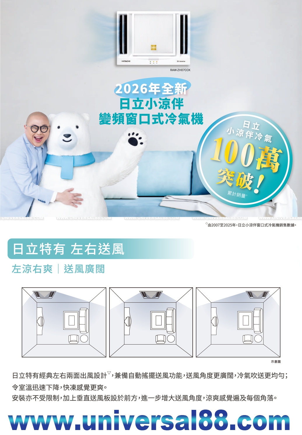 特點: All DC Inverter 變頻技術, 左右出風口 WiFi智能操控: airCloud Go應用程式 原廠全機三保用(五年壓縮機保用) 日立牌RAW-ZH13CCK 全新小涼伴變頻窗口式冷氣機 1.5匹 (無線遙控型) 製冷效能: 11,940 Btu/h 採用 R32 環保雪種 All DC Inverter 變頻技術, 快速製冷, 加倍寧靜, 高效節能 全新高效直流變頻壓縮機及DC風扇摩打 左右出風口 PM2.5 Wasabi納米鈦空氣過濾網 納米鈦不銹鋼塗層前置過濾網 AQtiv-Ion Lite活氧離子 FrostWash自潔洗 極淨UV Clean WiFi智能操控:airCloud Go應用程式 Air Sleep睡眠定時 藍鑽保護塗層 R32環保雪種 可以遙控或操作面板操作 24小時時間掣 All DC Inverter NEW Highly Effective Inverter Compressor and DC Fan Motor Silver Ion Filter, 99% Anti-bacterial* Pre-Filter Filter Dirty Indication Light Dehumidifying Function Auto Swing of Deflectors Sleep Mode Gold Fin Epoxy Coating Remote/ Panel Control 24 hours Timer 電量輸入kW: 製冷: 1060W 電壓: 220V 尺寸: W560 / H375 / D709 mm 重量: 38.0 kg 送基本標準安裝及送貨 優惠期由01/04/2026至30/06/2026止