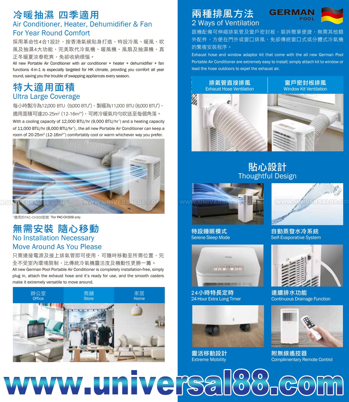 特點: 每日抽濕30L公升, 獨立抽濕功能, 自動蒸發冷水系統節能省電 原廠一年免費保用 (壓縮器三年) 2023年6月德國寶 PAC-CH309 1匹移動冷氣機 German Pool Portable Air-Conditioner 冷氣能量: 9,000 BTU/h 暖氣能量: 8,000 BTU/h 2023年全新德國寶流動式冷氣空調 1HP Portable Reverse Cycle Series 一匹移動式冷氣機 / 暖氣機 "活動冷氣" 冷氣, 暖氣, 獨立抽濕模式 製冷及製暖能力高達9,000 BTU/hr 無需安裝,隨心移動不受室內環境限制 冷、暖、吹風、抽濕4合1,四季皆宜 環保自動蒸發水冷系統 3段風速選擇(高/中/低) 頂置LED顯示屏: 清晰顯示冷風, 暖風模式, 設置溫度及室溫, 使用更方便 特設睡眠模式: 自動將風速調至最低, 降低運行聲音, 享受舒適寧靜睡眠環境 特設睡眠模式及24小時定時功能 24小時特長定時關機(Sleep Timer): 可按個人需要預先設置1Hr-24Hr小時吹風與 關機時間, 貼心方便 強勁抽濕: 30L 公升/日 免安裝, 即買即用 體積纖巧, 易於擺放及收藏 活動滾輪方便移動及存放 附設無線遙控器 自動蒸發水冷系統, 利用製冷時所產生的水份冷卻機身及散熱, 既環保又節能 附設排水箱, 方便操控 附有窗隔裝置, 可將冷氣放置室外, 於室內享受更佳冷氣 或暖氣效果 靈活移動設計: 貼心配備360˚活動滾輪, 從廚房, 客廳到睡房, 方便移動又慳力 高效R290環保雪種, 具備特快製冷及強效冷凍的特性, 啟動移動空調後能瞬間降低室溫極速掃走一室悶熱, 而且不含氯元素, 全球暖化潛能值極低, 對臭氧無害之餘, 比一般雪種更環保 兩種排風方法 2 Ways of Ventilation: 跟機配備可伸縮排氣管及窗戶密封板, 裝拆簡單便捷, 無需其他額外配件, 方便在門外或窗口排風, 免卻傳統窗口式或分體式冷氣機的繁複安裝程序 附無線遙控器: 將全功能操控掌握在手, 方便隨時切換各種模式及調控溫度 電壓: 220-240V 50Hz 1,080Watts (最大) 空氣流量: 250 m³ 適用面積: 12-16 m² 平方米(約130~170平方尺) 尺寸: W340 / H694 / D300 mm 20.2 kg (主機) 尺寸: W403 / H886 / D403 mm ** kg (包裝尺寸) 顏色: 白色 (Colour Silver) 附有配件: 排氣管, 窗口密封板, 排水管, 遙控器 附有1.5m 米排風喉 (150mm直徑) 另購配件: 附有3.0m 米排風喉 (150mm直徑) MP$490.- 窗隔排風裝置PAC-KIT MP$398.- 請親臨本店參觀及試聽效果