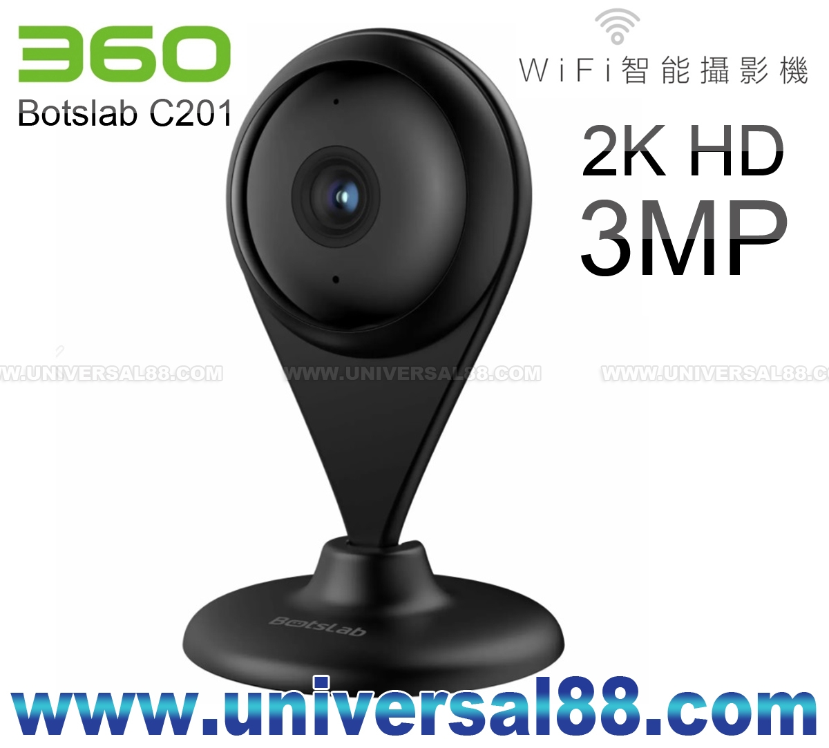 支援錄影時間5~212天(2K~480P) Wi-Fi連結: WiFi IEEE 802.11b/g/n, 2.4GHz 數據制式: WEP(40 bit, 128bit); WPA(AES); WPA2(AES) 攝像鏡頭: 四層全玻璃光學鏡片 夜視功能: 7m米高亮度IR紅外線夜視LED (不見光) 電源輸入: Micro USB, DC 5V / 1A, 2.5米USB連線(已提供) 支援流動電源 工作溫度: -5°C~40°C室內 APP兼容: Android, iOS, PC (網頁介面觀看) 裝置兼容: 智能手機, 平板及電腦 進階功能: 人臉辨識 /人形判定 360 C201 2K Version Smart Camera 2K resolution, with 130° view angle Support up to micro SD card to store