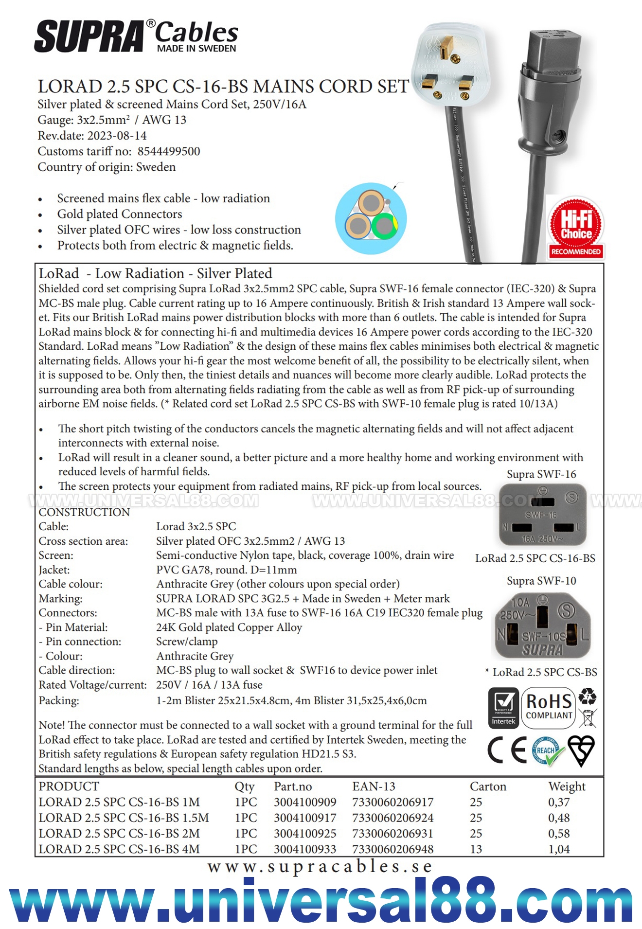 原廠三年保用 瑞典 Supra LoRad 2.5 SPS CS-16-BS (13A)