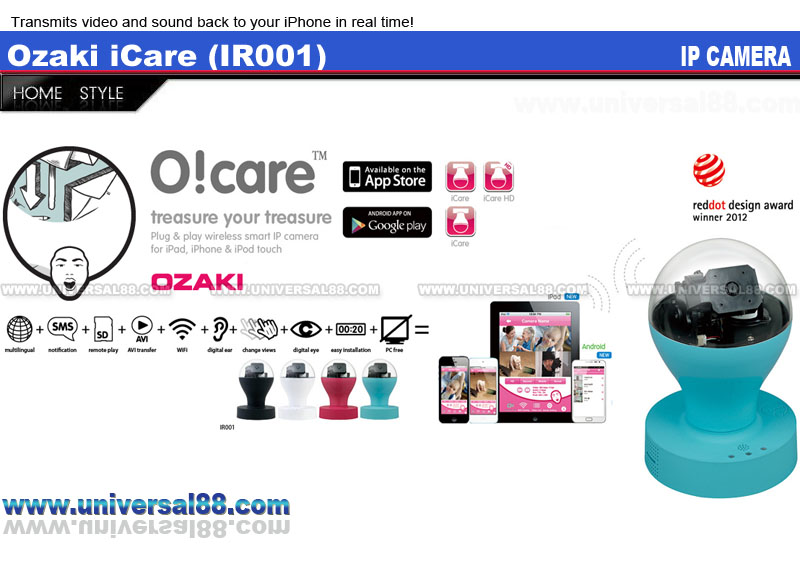 特點: 即時錄影, 即時傳送聲音及影像, 特闊視野角度, 配合鏡頭移動覆蓋垂直90°水平130°範圍 原廠一年保用 全新產品OZAKI IR-001 iCARE無線搖距監察攝錄機 無線智能網絡眼仔 無論何時何地, 想即時見到察看Baby與寵物的一舉一動; 又或者想聽聽來自遠方一把熟識的聲音, 只需運用你的手指, 在螢幕上輕輕一掃, 鏡頭便會跟隨你想要的方向移動 同樣地用雙指作出平時慣用的放大動作, 畫面便會跟著放大, 為你帶來革命性的家居監察新體驗 IP CAMERA 無線網絡攝影機, 一嘟即用 以iPhone, iPad iPod 及android 手機SAMSUNG NOTE & SAMSUNG SII / SIII 等等, 觀看即時影像及聲音 無時無刻觀看您家中的BB及老人家 簡易設計, 以IOS系統簡易安裝 警告通知,可設定警告範圍, 系統自動利用電郵通知到手機 隨時隨地錄影及拍照 更可在即時觀看畫面時, 隨時利用手機按下"拍攝", 相片即時 儲存在手機上 更可以隨時利用手機觀看及播放錄影影段 (Live viewing & rewinding) 更可利用手機操縱不同角度的攝影方向 只需用手指在屏幕上向上左右上下輕輕一點, 便能移動鏡頭, 或以兩指控制放大縮細 支援最多20個裝置或用於不同地方控制及使用 座檯或天花倒轉安裝 (附有天花安裝架) 簡易操作, 20秒內完成設定-於iTune上搜尋iCare+ iCare + App免費下載 內置月曆功能, 方便按日期搜索拍下的影片及相片 同時支援有線 / 無線網絡連線 IEEE 802.11 b/g/n 內置收音咪Built-in Microphone 影像移動偵測, 並可以E-mail發送提示 支援解像度: 640 x 480 特闊視野角度: 配合鏡頭移動, 覆蓋垂直90°水平130°範圍 支援智能手機及平板電腦視頻回播功能 支援17個國家語言(Support 17Language) Micro SD插咭槽 (Max 32GB), 可連續錄影5天 顏色: 白色 / 黑色 可供選擇 (新到: 粉紅色 / 粉藍色)