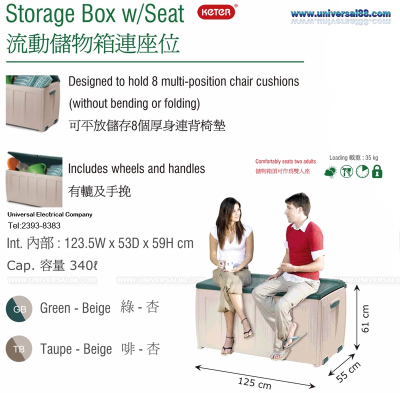特點: 儲物箱頂可為雙人座 原廠行貨 可平放儲存8個厚身連背椅墊 有轆及手挽 流動儲物箱連座位 容量:340L 内部尺寸: W1235 / H590 / D530 mm (闊48.6"/ 高23.2" / 深20.8") 外部尺寸: W1250 / H610 / D550 mm (闊49.2"/ 高24" / 深21.6")