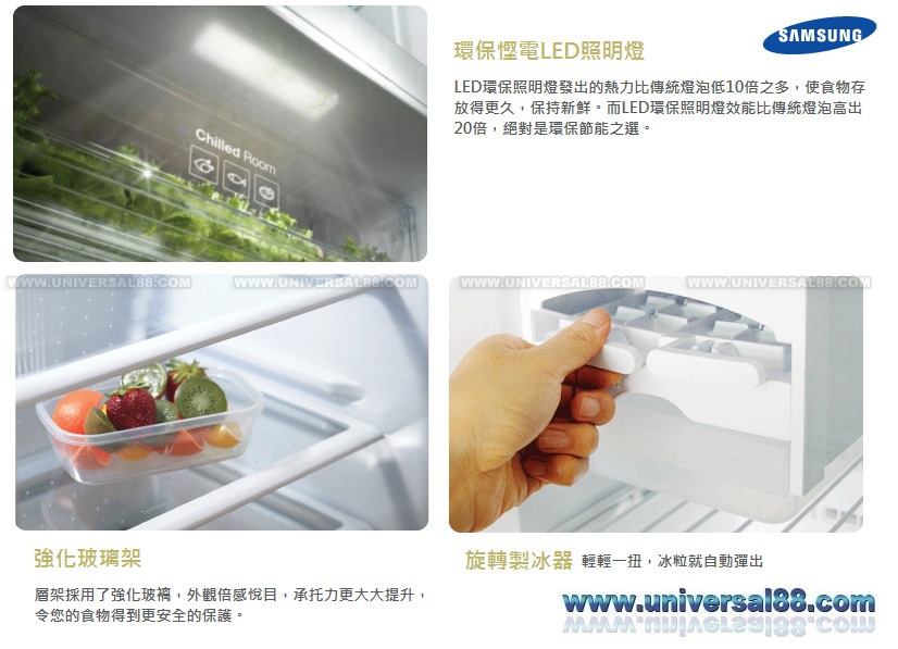 特點: 強化玻璃層架, LED照明燈, 1級能源效益標籤 3年全機保養 智能變頻壓縮機 (壓縮機10年保養) 2013年9月全新三星牌RT25FARAC 雙門環保雪櫃 淨容量: 255L 冷凍室淨容量: 53L 冷藏室淨容量: 202L 冷凍劑: R-600a 環戊烷絕緣 90°開門設計 即使當雪櫃門只能打開至90°MoistFresh濕度保鮮區仍然可完全拉出, 大大方便了居住環境狹小的家庭, 放於牆角, 盡用每吋空間 冰鎮儲存格 易開手柄 強化玻璃層架 (Tempered Glass Shelf) 濕度保鮮區 獨有的濕度保鮮區的革命性設計有別於傳統保鮮技術, 它能緊封區內的濕度並維持合適的水平以達至更佳的保鮮效果 濕度保鮮區蓋掩: 強化玻璃層架 多用儲存架 上層瓶架 底層儲存架 雞蛋儲存格 (6隻) x 2 氣味過濾器 自動照明燈: LED Light LED環保照明燈發出的熱力比傳統燈泡低10倍之多, 使食物存放得更久, 保持新鮮 LED環保照明燈效能比傳統燈泡高出20倍, 絕對是環保節能之選 1級能源效益標籤 無霜冷卻 層層出風 能源效益: ISO A++ 冷凍室特點 製冰器: 旋轉式 旋轉製冰器 - 輕輕一扭, 冰粒就自動彈出 層架: 塑膠(半層) 2個儲存架 顏色: 鈦金屬色 手柄: 隱藏式 淨闊度: W555 / H1635 / D637 mm 高度連門鉸 深度連隱藏式手柄 淨重: 50.7 kg 產地: 泰國