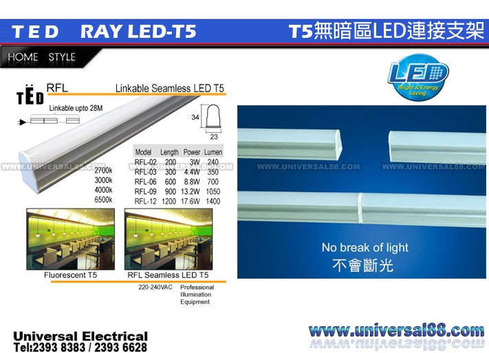 特點: 簡易安裝取代舊有普通筷子管, 一開即亮, 冷光技術, 減少50%的熱力, 減低空調成本 原廠1年保用 RAY LED T5 TED RFL-03D/W T5 LED 無暗區連接支架 TED Lighting專業製造 香港工程照明名牌 高亮度芯片, 替代支架, 節能達43% 無暗區連接設計, 眞正解決燈槽燈箱黑影問題 支架尺寸耩心設計, 可以組合出任意長度 三針三線, 高性能驅動,適合大工程用 迷你外形, 配合最時尙薄燈槽及薄燈箱設計 單電路可連接達28米, 大大節省線材及人工 輸入電壓: 220- 240VAC LED平均壽命> 35000小時 安全標準: CE 長度: 300mm 功率: 4.4W 流明度: 350Lumen 色溫: 冷白光Day Light 6500K 另有暖黄光Warm White 2700K