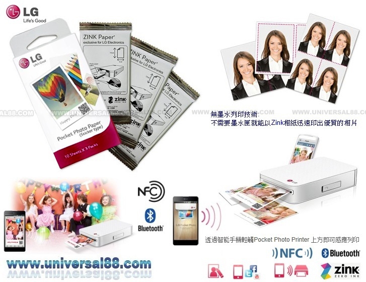 特點: 內置充電池, 透過藍牙連接 Android 以及 iPhone iOS智慧型手機即可列印照片 原廠一年保用 2014年6月全新LG PD239 手提無線流動相片打印機 LG POPO 3.0 Pocket Photo Printer 別將美好的時刻深藏在手機裡面, 把它列印出來並賦予生命與親朋好友分享 美好時光 隨時精采上印 LG Pocket photo 3.0 口袋印相機 風格照片智慧編輯 隨時隨地快速列印 社群網站即時分享 免墨水列印技術-無墨水列印技術 不需要墨水匣就能以 Zink 相紙迅速印出優質的相片 聰明列印 立即享受 透過藍牙連接 Android 以及 iPhone iOS智慧型手機即可列印照片 智慧型手機(NFC)輕觸口袋相印機上方即可感應列印 LG Pocket photo 輕巧時尚設計便於攜帶, 智慧 App 編輯功能 可以隨心所欲裝飾相片, 透過藍牙無線傳輸快速完成列印 濾鏡效果, 美化潤色 透過濾鏡效果可以變更相片的氛圍並潤飾您的照片, 例如: 鮮明 / 古典 / 黑白 / 冷色調 / 暖色調 / 柔和 / 矇矓 / Lemo / 懷舊等等! 紀念日:加上日期, 您將不會輕易忘記重要的紀念日 各種趣味相框: 透過 LG Pocket photo app 的相框功能, 您可以依照不同的紀念日主題來選擇適合的趣味相框與更多人 分享您珍貴的回憶: 透過照片分割功能, 可以跟更多人分享您的珍貴回憶 歡樂分享QR code可置入日期 / 地點 / 備忘語錄, 透過LG Pocket photo app 您可以製造專屬的QR code並列印在相片上。並立即透過社群網站 例如: Facebook & Youtube 等分享你當下的喜悅 適用各種皮夾的照片 享受更輕巧的相片, 您可以堅持原有2"x3"吋 的相片大小或自行剪裁想要的尺寸 分割照片功能, 自製大頭照 可將照片分割成不同的尺寸, 自製大頭照, 運用在多種用途上 自製邀請卡: 您可以自製各式有趣的相片小卡, 送給親朋好友 並且製作專屬的 QR code 來附上備忘語錄 照片檔格式: JPEG / PNG 支援手機: iOS, Android 2" x 3" 2R相紙 列印解像度: 313 x 600dpi 藍牙連接v4.0 NFC 連接 無墨水列印技術 LG Pocket photo App. USB (v2.0) - Micro USB USB (v2.0) - Micro USB 紙匣: 最多可放15張相紙 消耗品: (LG PS2313 Sticker Photo Paper 貼紙相紙) 消耗品: (LG PS2303 Smart Photo Paper ZINK相紙) 尺寸: W72.4 / H120.9 / D24 mm 重量: 221g 顏色: 優雅白(White) 另有 甜心粉 (Pink) / 淘氣黃(Yellow) 可供選擇