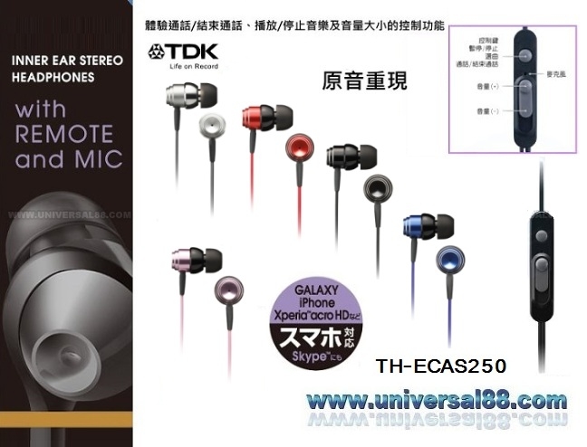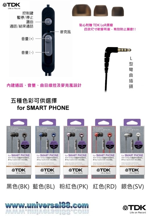 特點: 附設多功能線控及咪高風免提裝置, L型鍍金插頭, 內建通話 / 音量 / 曲目功能 原廠12個月保用 TDK TH-ECAS250內耳道式耳筒 "Premium In-earphone" 2014 CLEF Smart Series 輕質鋁合金機身, 外型堅固且細膩 內耳道式耳筒保證舒適 專為iPhone / HTC-android / Samsung-galaxy智慧型手機設計 耳機附設多功能線控及咪高風免提裝置 採用直徑10mm驅動內部結構及鋁合金材質, 讓您在聆聽音樂時能呈現出最佳音效 內建通話 / 音量 / 曲目線控及麥克風設計 頻率反應20-20000 Hz 阻抗16 ohm 靈敏度 105dB L型鍍金插頭(3.5mm) 貼心附贈 : 手提袋, XS/S/M/L 四種尺寸耳套, 適應不同的耳朵大小 繽紛色彩, 多樣化選擇 顏色: 紅色(GD) 另有銀色(SV), 黑色(BK), 藍色(BL), 粉紅色(PK), 可供選擇