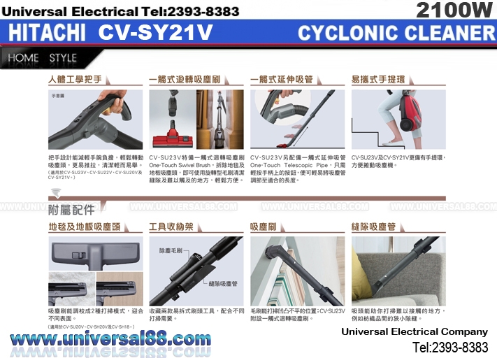 特點: 7層空氣過濾系統, 無袋設計及吸塵紙袋兩用, 伸縮型延長管 原廠一年保用 全新HITACHI CV-SY21V旋風式吸塵機 功率2,100W 強力馬達 480W 強勁吸力 旋風式集塵系統 HEPA高效能過濾網 7層空氣過濾系統 先進塵埃壓縮技術, 提升吸塵量 無袋設計Bagless Design或吸塵紙袋兩用 伸縮型延長管 英國抗敏感認證 多角度旋轉吸塵頭 易攜式手提環 納米鈦空氣過濾網 迴轉吸塵刷 集塵器1.6L 公升 紙袋型號:PBAGCVSH20 電線長度: 5.0 m (米) 電壓: 220-240v 50Hz 2100Watts 尺寸: W278 / H226 / D389 mm 淨重: 4.9 kg 公斤 顏色: 瑰麗啡 (BR)
