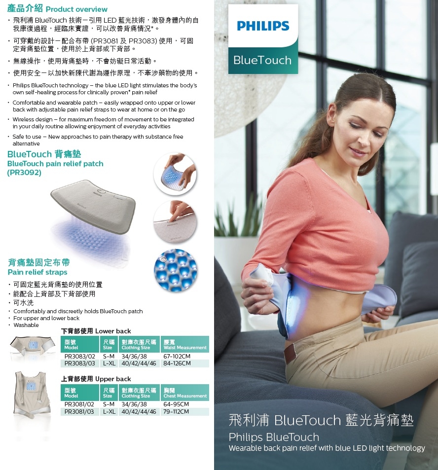 原廠一年保用 飛利浦PR3081/02 上背部布帶(S - M 碼) 需配合BlueTouch 藍光背痛墊 PR 3092 使用 固定背痛墊位置於上背部 可水洗 適合腰圍 25" 吋- 37" 吋 PHILIPS BlueTouch Pain Relief Patch Strap S/M Upperback PR3081/02 Adjustable breathable straps Size S-M Comfortable at home and on the Philips BlueTouch can be worn comfortably
