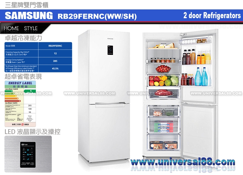 特點: 智能變頻壓縮機10年保養, 易拉層架大大提高儲存量 3年全機保養 智能變頻壓縮機 (壓縮機10年保養) SAMAUNG RB29FERNC(WW/SH) 雙門環保雪櫃 頂照式LED燈節能環保, 特設冷凍室鮮更佳 雪櫃擁有超卓的能源效益表現, 每年耗電量為285kwh 比一級能源標籤的最低標準更省電45.5% 三星雪櫃的卓越冷凍能力能保持食物新鮮, 而且可讓你儲存更多食物, 生活更健康 Samsung一直支持環境保護, 並透過致力研發各種創新的產品技術 使旗下多款產品均符合ISO A++能源效益標準, 除了可為環保出一分力 亦能替用戶節省能源及金錢 LED 液晶顯示及操控, 方便您控制雪櫃的溫度和冷藏模式, 外觀簡潔俐落, 專為追求時尚品味的人士而設計 即使當雪櫃門只能打開至90°, MoistFresh濕度保鮮區仍然可完全拉出 大大方便了居住環境狹小的家庭, 放於牆角, 盡用每吋空間 RB29FERNC 雪櫃備有碳金屬色及雪白色, 迎合您的品味,為您的廚房增添一份時尚的感覺 三星提供10年特長保養期, 保證長壽數碼變頻式製冷壓縮機的持久耐用 為了確保10年的保養期, 三星不斷致力改善組件質量及優化產品設計 這不旦增強了三星的技術, 而且不需使用昂貴的組件也可延長耐用性 有效的轉速調整, 提高保濕度而讓食品更持久長效保鮮, 大量減少了浪費掉的食物 數碼變頻式製冷壓縮機相對傳統型號, 把可察覺的噪音降低了4.5分貝 達到令人難以置信的38.5分貝更讓人讚賞的是 所降低了的4.5分貝可把本來令人不安的噪音, 變成平和及讓人不感到壓力的聲音 多層出風氣流通過每一個層格, 為雪櫃提供穩定和均勻的溫度 當打開櫃門, 它能夠迅速調節至恰當的溫度, 維持最理想狀態, 長時間確保食物的品質 Samsung的無霜冷凍型號雪櫃不會結霜, 用家從此不再為溶霜煩惱 冷凍自選區是 Samsung 雪櫃的創意設計, 在冷藏室內另設冷凍室 並將溫度調低至適合較長時間儲存肉類及其他容易變質食物 雪櫃和冷藏室皆使用 LED 照明燈不單單是為了節能 也可以令整體亮度提高, 方便照明, 而在節能效果上 LED 燈也十分顯著 而且可以減少由燈光所發出來的熱能 經精心設計的易拉層架, 方便您隨需要調動位置, 更容易擺放和提取食物, 靈活運用空間, 大大提高儲存量 門上大瓶架被分割成兩排, 各種瓶器可以按照您的意願獨立存放 特高的間隔亦可給你儲存高身瓶器 層架採用了強化玻褵, 外觀倍感悅目, 承托力更大大提升 令您的食物得到更安全的保護 容量: 總容量286L 冷凍室: 98L 冷藏室: 188L 冷凍功能: 無霜冷凍 多層出風系統 快速冷卻 冷藏室特點: 蔬果抽屜 冷凍自選區 層架數目: 2 易拉層架: 1 層架質料: 強化玻璃 櫃門儲存格數量: 4 乳類產品儲存格 雞蛋儲存格 照明燈: Top LED 冷凍室特點: 抽屜數目 3 製冰盤 LED顯示屏及控制 未關櫃門警號 (2分鐘) 冷凍室星級: 4星級 能源效益標準: A++ 耗電量: 285 (kwh/年) 冷凍能力: 12 (kg/24小時) 雪種: 100% 環保雪種 淨重量: 71kg 顏色: 雪白色 尺寸: W595 / H1780 / D668mm (W23.4 / H70.1 / D26.2 吋) *可更改門方向,訂購前説明開門方向