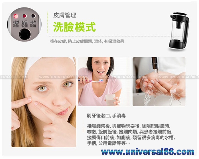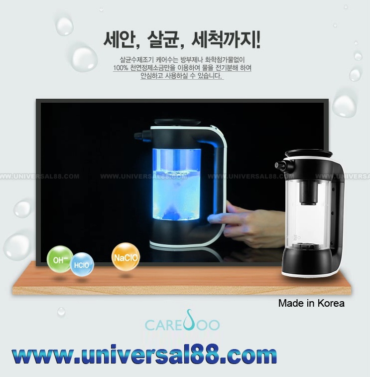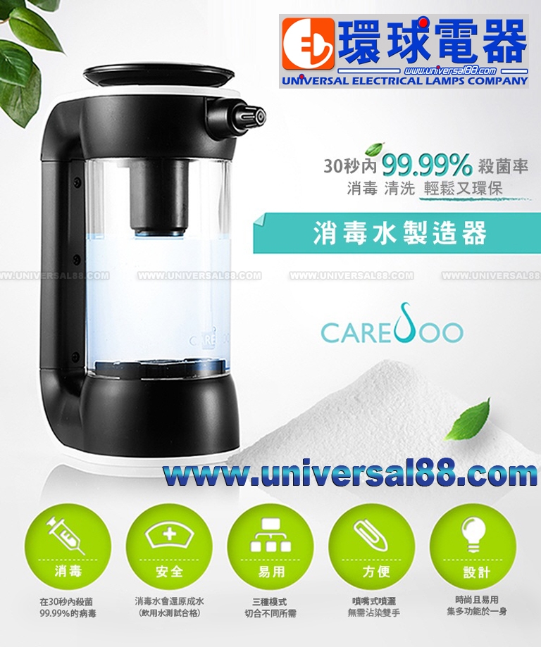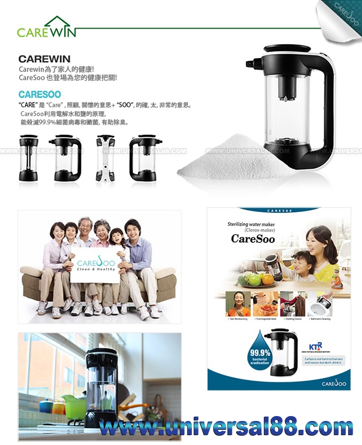 特點: 細菌及疾病預防方案, 製造電解釋放安全性氯氣, 噴一下即可達99.99%殺菌力 原廠一年保用 2016年4月CareSoo TS-300 消毒水製造器 CareSoo TF-S100 Sterilizing Water Maker 輕輕噴一下即可達到99.99%殺菌力 洗臉/殺菌/洗滌的用途及製造的方法共有三種模式 01.) 洗臉模式 自來水300ml使用洗臉模式操作一分鐘, 生成天然噴霧劑, 對皮膚具有保濕的效果 02.) 殺菌模式 自來水300ml+精製鹽03.g克使用殺菌模式操作三分鐘, 可使用在日常生活中各個範疇 (水果/蔬菜消毒,、衣物、廚房/兒童用品的消毒等) 03.) 洗滌模式 自來水300ml+精製鹽1.0g克使用洗滌模式操作5分鐘, 生成強力殺菌劑, 可使用在衛生污染嚴重的下水管、 衛生間等的清掃, 同時在洗衣時可代替漂白劑來使用 去除水果,蔬菜的殘留農藥, 浸泡在CARESOO 即可殺菌99.99% ! 人們對食品安全問題越來越重視, 大量購買各種洗滌食品 清潔劑的趨勢日益增長 現今對於食品專用清潔劑的要求也日益提升, 對人體無害的, 無毒性已成為了大眾最基本的需求 殺菌方法 用CARESOO的殺菌模式製造殺菌水後, 浸泡一段時間即可迅速殺菌! 不需要再用清水清洗, 對人體無害 通過水和精製鹽經過電氣分解生成OH-(氫氧根離子) / HClO(次氯酸) / NaClO(次氯酸鈉) OH-(氫氧根離子) 鹼性元素 HClO-(次氯酸) 對人體無害且可不分細菌的種類在短時間內發揮殺菌力, 又稱為"第三代"殺菌劑, 被使用許可在濃度為40PPM以下 的食品添加劑上 NaClO-(次氯酸鈉) 次氯酸鈉是消毒水的主要成分不僅可以殺菌同時也 可以用於洗滌, 與一般殺菌劑產品的效果相似, 同樣能去除各種細菌及黴菌 通過電解不僅能生成OH-(氫氧根離子) 添加鹽 1) 在自來水里添加精製鹽後通過電解, 水(H2o)被分解及生成氯(Cl-) 2) 被生成的氯(Cl-)通過電解釋放安全性狀態的氯氣(Cl2) 3) 氯氣又重新與水自然融合生成含有可持續殺菌效果的 次氯酸(HClO)及次氯酸鈉(NaClO)等.. 比起把要消毒的物品投浸到OH-(氫氧根離子)的殺菌劑裡, CARESOO噴灑式的殺菌方式更方便且有效殺菌 使用時間-鹽量: 清毒(殺菌劑): 5分鐘 / 1g 殺菌: 3分鐘 / 0.3g 洗臉: 1分鐘/ 0g 小童及嬰兒玩具: 時常在地上板的玩具及日常用品, 即可殺菌達99.99% 汽車內部: 無法經常清理的汽車內部及車內用品 寵物用品: 對病毒的免疫較低的寵物, 細菌及疾病的預防 CARESOO特有的功能: 洗臉/天然噴霧劑製造, 敏感的皮膚也OK! 對於皮膚的保濕也有卓越的功效 無化學添加物的天然噴霧劑製造! 市面上在出售的噴霧劑大部分都添加了香料或者化學添加物 所以皮膚病及敏感皮膚的人群使用後都會引起副作用 只要有CARESOO就可以在家中用自來水製造天然的噴霧劑 3種模式中, 選擇洗臉模式並用300ml的自來水製造一分鐘, 可將水的粒子進行淨化及微分解, 製造出天然的噴霧劑 將噴霧液裝入小噴瓶裡, 可隨身攜帶隨處使用 通過比毛孔還細小的水粒子, 可迅速的滲透到皮膚裡層並且在 保濕上有著卓越的效果, 乾燥的冬季使用後保濕的同時也可以 保護皮膚 電壓: 220V 50~60Hz 60W DC 12V/5A 尺寸: W88 / H154 / D214 mm 重量: 450g 產地: 韓國製造 (Made in Korea)