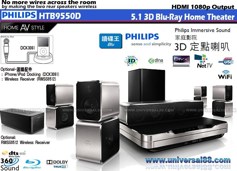 特點: 光纖音頻輸入, 2組HDMI輸入, 內置Wi-Fi無線接糾收器,網上瀏覽器 原廠1年保養 全新PHILIPS HTB9550D 5.1 3D藍光碟家庭影院 PHILIPS HTB9550D 3D Blu-Ray Home Threater System 360Sound反射系統喇叭 1000W RMS輸出功率 飛利浦獨家技術, 超耐久藍光讀碟王3D, 支援最多影音格式 光碟: 3D-BD, BD, BD-R/ RE, DVD, DVD±R/RW, CD-R/RW, CD, VCD 多媒體: USB 影片格式: AVCHD, DivX Ultra, MPEG1, MPEG2, MPEG4, RMVB 音效格式: AAC, MP3, WAV, WMA, FLAC, Ogg Vorbis 高清音效解碼: DTS-HD MA, Dolby True HD, PCM Instant 3D (2D 轉換3D功能) Skype網絡通話 (需使用Skype電話*) 內置HDMI Hub集線器 (兩組HDMI輸入) 內置Wi-Fi網絡 SmartTV互動功能 MyRemote智能手機Apps遙控器 NetTV互聯網瀏覽器 SimplyShare影音分享 1組HDMI輸出 (ARC) 1組RCA視頻輸出 2組HDMI輸入 1組光纖輸入 1組同軸輸入 1組RCA AUX輸入 1組USB輸入 1組MP3 Line-in 電壓: 110~127 / 230~240V 尺寸: W437 / H 75 / D342 mm (主機) 尺寸: W435 / H 85 / D111 mm (中置喇叭) 尺寸: W 99 / H247 / D117 mm (環迴喇叭) 尺寸: W295 / H375 / D295 mm (重低音) 尺寸: W560 / H645 / D400 mm 24.8 kg (包裝) 隨機附送: 遙控器, 高抗噪HDMI線, iPhone Docking 選購配件 DCK3061 iPhone Docking MP $499.- RWSS9512 後置喇叭無線接收器 MP$ 1,599.- STS9510 活動式喇叭掛牆架 (每對) MP $490.- STS9501 喇叭腳架 (每對) MP $1,290.- Skype專用Freetalk HD網絡視像鏡頭 喇叭線長: 中置喇叭: 2M 環迴喇叭: 前置4M / 後置10M 重低音: 4M 送PHILIPS DCK3061 iPhone4 Docking , 售價$499.- 加送3D HDMI CABLE多媒體高清訊號線, 價值$398.- 加送PHILIPS AEA2000 Bluetooth Hi-Fi Adaptador 飛利浦高音質藍芽接收器, 價值$399.- +$1,199換購PHILIPS STS1300 電視座地架, 價值$2,399.- 為使顧客能夠享受超高畫質4K解像度, 現凡購買此型號, 以優惠價$449.-換購PHILIPS SWV9401W 4K升頻HDMI線, 售價$899.-優惠期由01/09/2017延期至31/10/2017送完即止