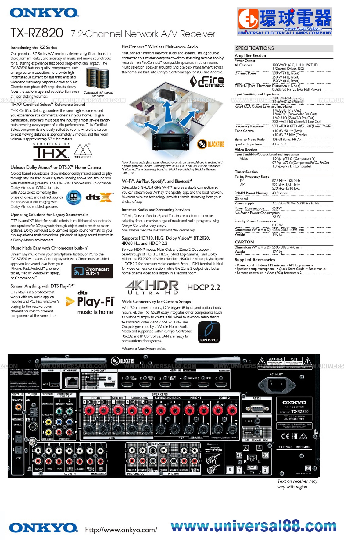 特點: 對應DTS:X, Dolby Atmos AV , AirPlay藍芽串流播放音樂, 內設Wi-Fi, 32-Bit DSP