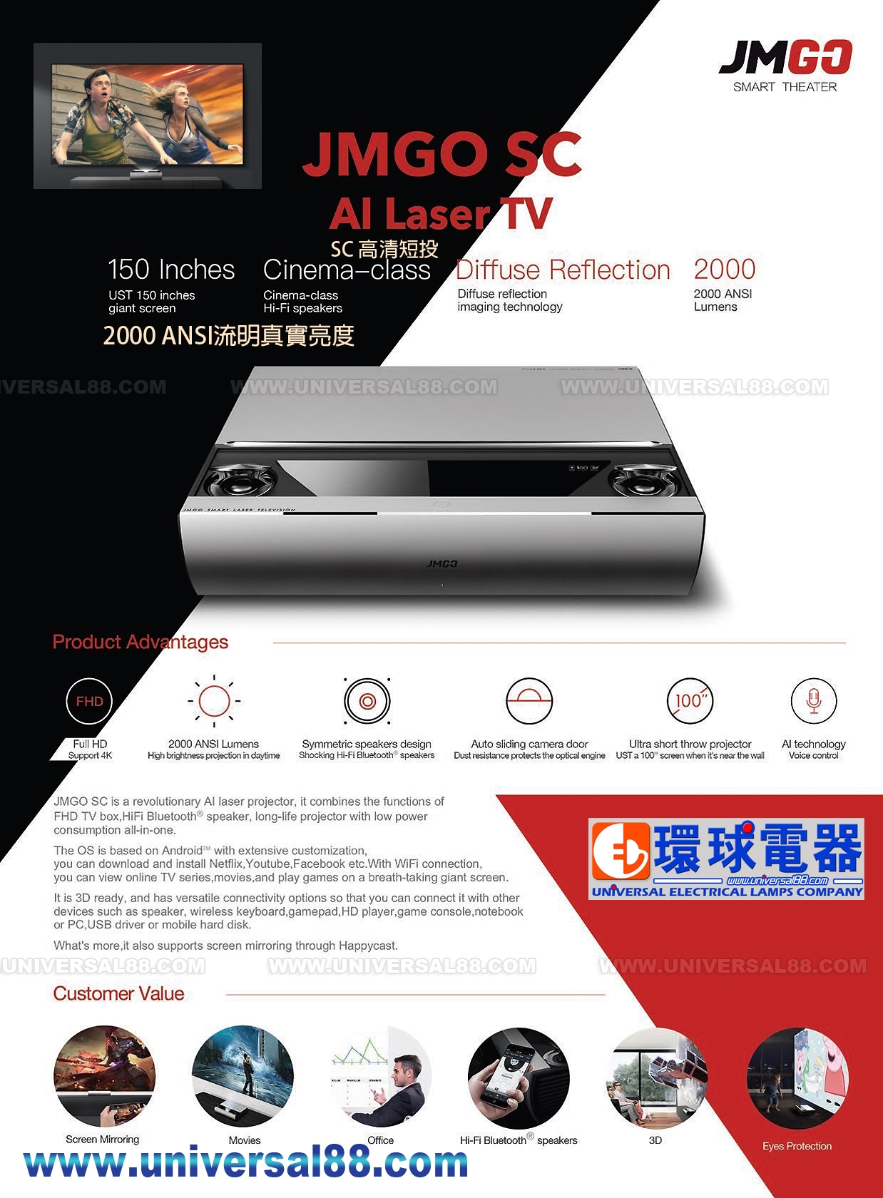 特點: 搭載安卓7.0系統, 流暢無卡頓, 電動開蓋後揚聲器會自動升起 原廠三年保用 堅果JMGO SC 超短投Laser 3D投影機 (JMGO Laser TV) 2000 Real Lumen JMGO SC AI Laser Projector Smart Theater 顯示板: 0.47 DMD 光源: Laser 解像度: 1920x1080 對比度: 3,000:1 ~ 5,000:1 鏡頭變焦: 自動變焦 流明度: 2,000 ANSI (真實流明) 對應: 1080P, 4K 屏幕距離: 100" 0.27m 米 - 200" 0.87m 米(100"~200") (只需51.5cm距離, 可投影100"寸影像) 投影尺寸: 60" ~ 300" 長寬比: 16:9 支援2D / 3D 播放 光源長達: 30,000 小時 每天觀影8小時, 約20,000部電影時間長度 投影方式: 正投 / 背投 / 吊頂 無線連接Wi-Fi, 即可把手機音視頻通過投影出來, 十分方便使用 自動開合滑動合保護蓋 開蓋後立體聲揚聲器會自動升起 直播智能手機影片, 相影及內容等等.... 支援高清訊原: 480i/p / 576i/p / 720i/p / 1080i / 1080p & 4K 定焦鏡頭, 投射出300"吋大畫面 可投射60"吋~300"吋畫面, 低耗電量 梯形矯正+ / -45度 操作環境 溫度 *℃~**℃ 內置喇叭裝置 Soundbar **Watts x 2 (RMS) 內置低耗電藍牙4.0 內置Wi-Fi 2.4GHz 801.11b/g/n藍牙4.0 搭載安卓Android 7.0系統, 流暢無卡頓 CPU: 四核處理器 GPU: 四核GPU RAM: 1GB DDR3 儲存ROM: 16GB Flash 操作系統: JmGO OS 支持H.264 4K / 2k 30fps格式解碼, 特別支持H.265 4K/2K 60fps 超高清解碼: MPEG1/2/4/.264/HEVC(.265)/ Divi/VC1/RM/AVS/AVS+/VP8/VP9 接筆記型電腦, 支援HDMI訊號: 例如數位相機/手機/多媒體硬碟撥放盒 開關機時間短, 不需要關機後, 無須冷機後才能移動投影機 附有IR紅外線遙控器 噪音: 32dB 2組HDMI高清輸入(ARC) 1組USB輸入(USB 3.0) 1組USB輸入(USB 2.0) 1組USB輸入(Mini USB) 1組數碼光纖輸出(Digital Optical Output) 電壓: 100-240V 250Watts 尺寸: W416 / H100 / D310 mm 8.0 kg (主機) 尺寸: W560 / H200 / D420 mm *** kg (包裝尺寸) 總量: 8.0kg 顏色: 銀色 (Silver) 隨機附件: 13A電源線/ 紅外線遙控器 送超高清HDMI CABLE Ver2.0 2m, 價值$498.- 同時購買JMGO 100"抗光幕即減$1,000.- 優惠期由01/05/2024至31/07/2024止
