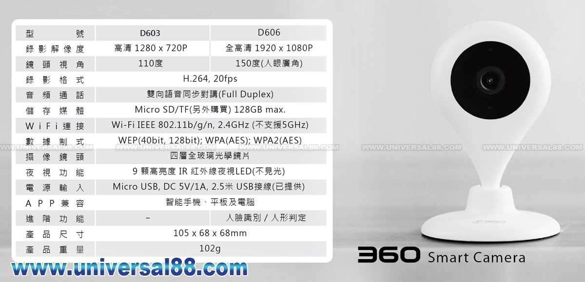 特點: 紅外線夜視, 麥克風和揚聲器, 雙向對話, 支持SD咭及360雲端錄影