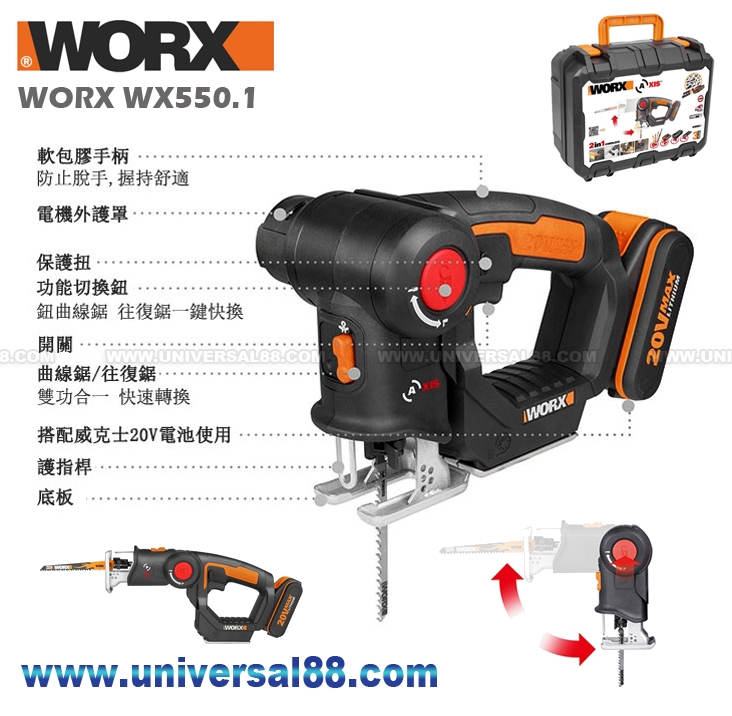 原廠3個月保養-主機(香港行貨) WORX WX550.1 20V Lithium Multi-purposed Jet Saw 20V鋰電無碳刷多功能機迷你電鋸 設有白光LED照光燈 無段變速 空載轉速: 0-3000轉 衝程長度: 20 mm 充電時間: 約1小時 曲線鋸模式: 木材: 50 mm PVC管: 50 mm 鋼材: 4 mm 往復鋸模式: 木材: 100 mm PVC管: 127 mm 鋼管:76 mm 保險鎖 尺寸: W218 / H170 / D128 mm 重量: 1.9 kg 電壓: 100~240V 50/60Hz 50Watts 附有2粒2.0AH鋰電充電池及60分鐘充電器, 附有木工鋸片, 木工往覆鋸片 , 金屬鋸片, 切鋁鋸片 附有原廠工具收納膠箱 * 注意: 不能與綠色電池或充電器共用