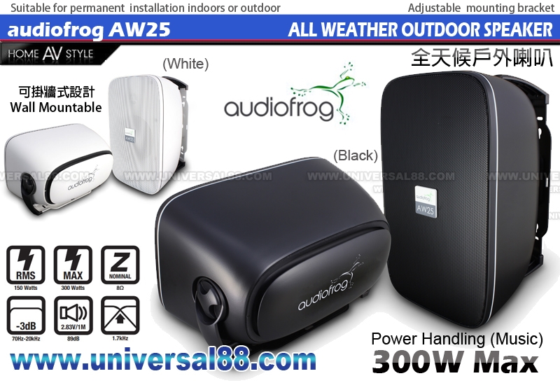 小喇叭也有強勁震撼力 備有黑色/白色可供選擇 背部更設有低音氣墊 All Weather Full Range Outdoor Loudspeaker Audiofrog's AW25 all-weather outdoor loudspeakers are designed to provide the accurate and detailed sound you've come to expect from a new and leading brand of performance-built application-specific loudspeakers. The AW25 features a 5-1/4" woofer, 1" tweeter and passive radiator in a rugged and durable injection molded polymer enclosure suitable for permanent installation indoors or outdoors. Typical installation against a wall or ceiling provides reinforcement of the output of the passive radiator for great bass performance sure to provide a "Wow" A second order integrated passive crossover at 1.7 kHz provides a smooth transition between midrange and tweeter and a tweeter protection circuit prevents the tweeter from being overdriven. AW25 speakers include an adjustable mounting bracket and a connector with a pass-thorough connection to make wiring a system with multiple speakers simple and neat. Woofer: 5-1/4"Waterproof polypropylene cone and dustcap 1" copper voice coil Tweeter: 1"water resistant treated textile dome Passive acoustic equalizer Power Handling (Continuous Average): 150 Watts Power Handling (Music): 300 Watts Nominal Impedance: 8 Ω Sensitivity (2.83 V / 1 M): 89 dB Frequency Response (-3 dB): 70Hz – 20kHz Recommended Amplifier RMS Power: 25-150 Watts Crossover: 12 dB/octave @ 1.7 kHz with tweeter protection and impedance compensation 尺寸: W182.43 / H303 / D187.11 mm (Including Mounting Bracket) 顏色: 白色(White) 另有 黑色 (Black) 可供選擇