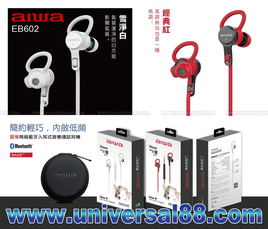 原廠一年保用 2019年10月日本愛華 EB602 立體聲無線耳筒 AIWA EB602 WIRELESS BLUETOOTH 時尚扁平線材, 外出運動不糾結 功能鍵: 音量+ /音量- / 接聽鍵 諧波失真(THD)小於0.1%和1mW 傾斜入耳式設計: 完美貼合耳道, 配戴更舒適 密閉效果佳, 減少音漏, 隔絕噪音 愛華音質-完美融合渾厚的低音和柔滑的聲學 使用藍芽4.1版本: 實現無縫數據傳輸及降低音樂傳輸功耗 安全+舒適貼合+內置全方位麥克風, 適合長途通勤或戶外鍛煉 BASS++增強的低音配置工藝技術, 讓每一個音符和節奏栩栩如生 以CSR8645 Qualcomm aptX Codec技術, 提供等同CD的音頻質量 優秀的線材製造工藝 (採用6N OFC 無氧銅銅線材質) 引領醇厚好音質的線材導體 支持iOS / Android 充電時間: 2Hr 小時 通話時間: 6Hr小時 5分鐘無連接自動關機 高通Qualcomm CSR8645 A2DP / AVRCP / HFP / HSP MicroUSB DC 5V 尺寸: W120 / H190 / D50mm 重量: 19g 附有配件: 收納袋/ 3對大中小尺碼耳塞 顏色: 白色 / 紅色