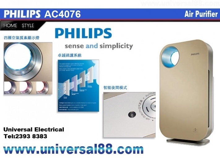 特點: 空氣質素顯示燈, 有效過濾裝修後產生之甲醛 原廠2年保用 飛利浦AC4076 空氣淨化器 時刻擁有健康新家居 PHILIPS全新家居空氣清新機 為您帶來健康的家居環境 特大容量甲醛濾網能有效即時去除甲醛及 有害氣體, 裝置內的濾網清潔/更換提示及 清新空氣保護鎖確保您時刻擁有 清新怡人的空氣 時刻擁有健康新家居 配備特大容量甲醛濾網 潔淨空氣輸送率 302 m³/h 過濾甲醛達 99% (2 小時) 過濾PM2.5 超過 99% 四種顏色顯示燈清晰反映空氣質素: (藍色-極佳 ; 深紫色-良好 ; 紫色-一般 ; 紅色-欠佳) 智能夜間模式於夜間操作時將光線及 聲音減至最低: 在自動模式運行中, 當房間光線變暗時產品 會自動切換到夜間模式 於夜間模式, 指示燈會熄滅(電源開/關燈除外), 風扇速度和音量會降至最低, 如果房間光線在 五分鐘或之後再度變亮, 產品將恢復至正常運作 在夜間模式中, 自動運行模式仍處於活動狀態, 如果空氣質素良好, 產品將暫停運作, 如果空氣 質量轉差, 產品將會重新啟動, 但活動量較低同時 指示燈亦會熄滅, 用電量亦會調到最低 清新空氣保護提示功能會於適當時間 提示您更換濾網: 當需要更換新濾網時, 濾網清潔或更換提示 功能會作出提示, 如果未能於提示時間更換濾網, 產品將停止運作以防濾網被灰塵堵塞, 而未能有效過濾空氣 清新空氣保護鎖確保時刻擁有清新空氣: 清新空氣保護鎖功能確保時刻擁有清新空氣, 如果無法確保持續提供清新空氣, 產品會停止運作, 如果其中一個濾網已滿 且需要清理或更換, 濾網清潔或更換提示功能 會向您發出警告並提示您更換或清理濾網 如果用戶沒有於指定時間內更換相關濾網, 產品會停止運作並鎖上 特強風速模式以最高速度即時清潔空氣: 高速模式以最即時高速度清潔空氣 雙重智能空氣感測器讓您全面掌控空氣質素" 透過檢測與控制, 您可以獲得清晰完整的 空氣質素意見 全自動操作確保整個運作無需勞心費神: 全自動運作確保功能正常, 內置的微粒 感應器會量度並因應房間內的空氣質素 自動選擇適當速度設定以確保室內空氣 質素處於最佳狀態 多種顏色指示燈讓您瞭解實際空氣質素, 如果空氣質量未能達至最理想的標準, 指示燈將呈紅色、紫色和深紫色顯示, 如果空氣恢復最理想水平, 指示燈將呈藍色顯示 配備特大容量甲醛濾網: 特大容量甲醛濾網清除空氣中的有害物質, 清除甲醛特別有效, 前層濾網捕捉較大粒子 如人類或寵物毛髪及一般家居塵埃, 德國科技 甲醛HEPA 濾網配備經特別處理的活性碳, 能夠即時清除空氣中的甲醛及其它有害氣體, 並同時有效消除過敏原及細菌 五重風速可讓您根據個人喜好調整風量 過濾甲醛>99% 過濾 PM2.5>99% 過濾甲苯>99% 過濾 TVOCs>99% CADR(香煙煙霧)**302 m³/h 過濾細菌>99.9%**** 裝飾環: 鋁 風速指示燈: 位於控制板面 前蓋: 金色 機身材料: ABS 塑膠 側邊板面: 金屬銀 智能空氣質素感測器: 微粒和氣味 電線長度: 2米 噪音水平: 31.6dB(靜音模式) / 63dB(快速模式) 適用面積: 60 平方米 (640平方呎) 電壓: 220~240V 50Hz 47W 尺寸: W354 / H645 / D194 mm (主機尺寸) 尺寸: W450 / H740 / D348 mm (包裝尺寸) 重量: 7.4 kg 總重: 11.18 kg 產地: 韓國製造(Made in Korea) 消耗配件: PHILIPS AC4147/00除甲醛濾網 MP$598.-