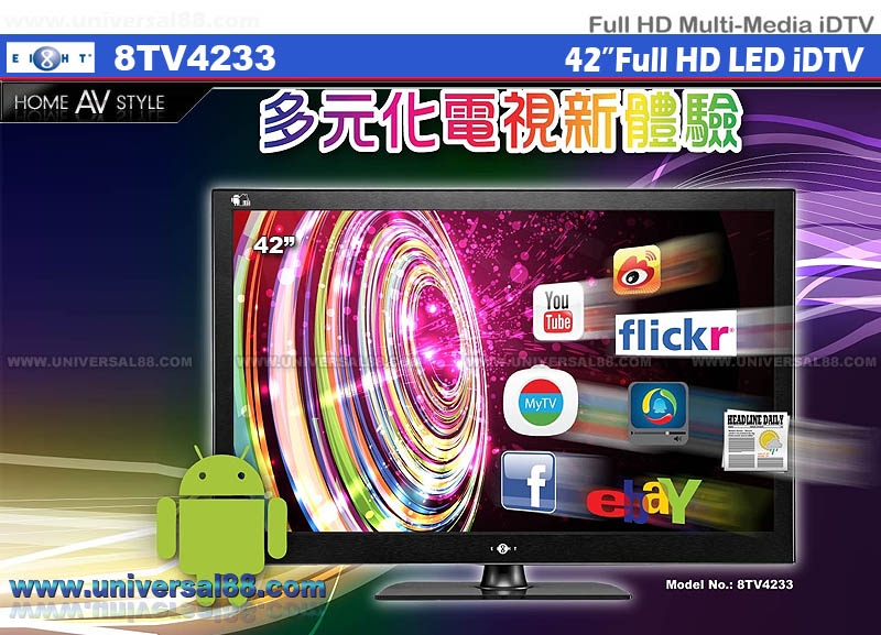 原廠2年保用 eight led tv" 全新型號Eight 8TV2433 可接收單載波及多載波於特定地區可接收中國高清台 內置數碼及模擬電視接收器 24吋高清液晶體電視機16:9 50Hz面優化技術 解像度: 1920x1080 採支援Adobe Flash, 隨時透過電視進Mytv觀看不同電視節目 Android作業平台進入各大社交網站, 如Facebook, Flickr 更可直接網上世界 預載Internet Brower進一步提升電視功能, 隨時瀏覽網頁取得 最新資訊 雙USB 2.0接口, 以支援滑鼠, 鍵盤等, 讓您上網更簡單方便 支援1080p,1080i 及 720p 反應時間: 8 ms 光亮度: 450 cd 對比度: 50,000:1 可視角度: 170° 度 音頻輸出:10Watts + 10Watts 關畫面待機錄影, 減低能源損秏/環保安全 7天節目表預錄 自動下載7天電子節目表單/預錄自選節目 排程功能, 方便易管理 可直接播放BMP / JPG / JPEG /RMVB / RM / WMA / MP3 & MPEG1/2/4 多國麗音: 廣東話 / 國語 / 英語 及日本語等等 定時自動開機 / 定時自動關機 即時顯示電視台天氣及其他資訊TVB Bar 4組HDMI輸入 1組色差輸入 1組RCA影音輸入 1組同軸數碼音頻輸出 1組電腦VGA輸入 2組USB輸入 1組SD CARD Slot插槽 電壓: 100~240v 140Watts 尺寸: W1014 / H684 / D256 mm 尺寸: W1014 / H*** / D*** mm 重量: 17.0 kg 送HDMI Cable Ver1.4 1.5m, 價值$288.- +$188.- 優惠價換購無線鍵盤內置手寫板, 價值$380.- +$99.- 優惠價換購Wi-Fi USB無線組件, 價值$250.- 優惠期由01/06/2013至31/10/2013止