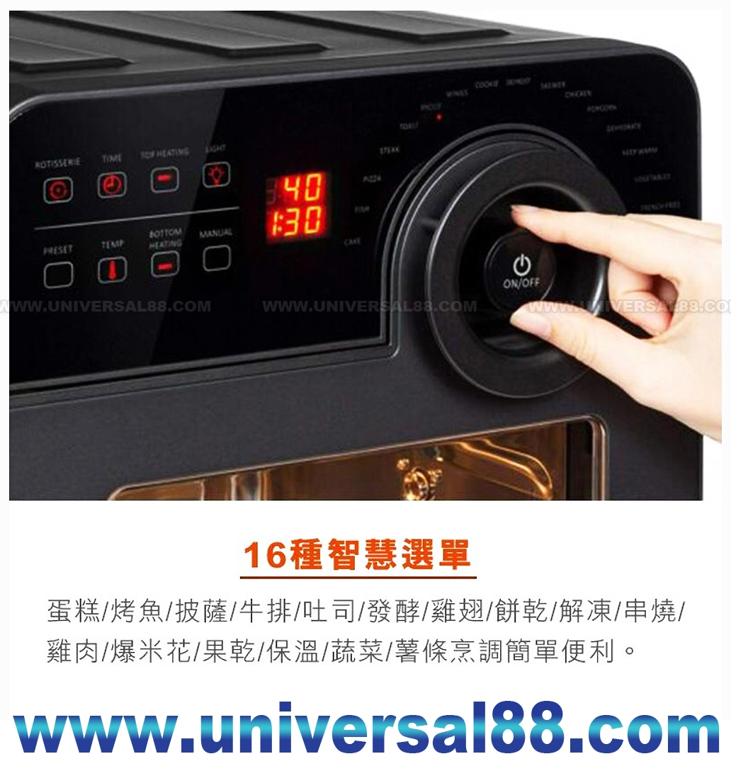 (機身小容量大, 電子式操作) (雙重加熱頂部和底部加熱) (溫度操控: 50°C- 220°C度) (輕鬆處理全隻雞自動旋轉) (可去除食物中的80%脂肪) 附有5件配件: 烤雞叉組, 轉籠夾, 層架, 網籃, 接油盤 LASTUPDATE: 31-03-2023