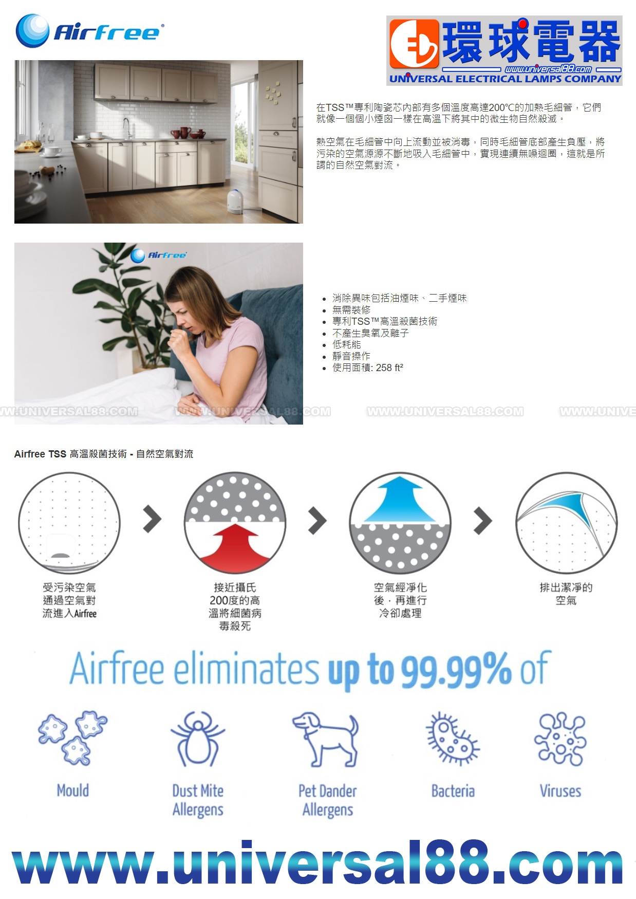 原廠二年保養(香港行貨) AIRFREE Duo AB 空氣消毒殺菌機 進行每天簡單而快捷的家居消毒 全新AIRFREE Duo AB 全方位空氣殺菌機 活性炭芯消除烹調, 異味包括油煙味, 二手煙味 專利TSS™高溫殺菌技術 不產生臭氧及離子 低耗電 靜音操作 環保的TSS專利技術, 產生約攝氏200度高溫殺菌 可消滅高達99.99%空氣中的污染微生物 超低耗電量, 低於一個標準的60瓦燈泡 無需更換濾網, 可避免因更換濾網而再次