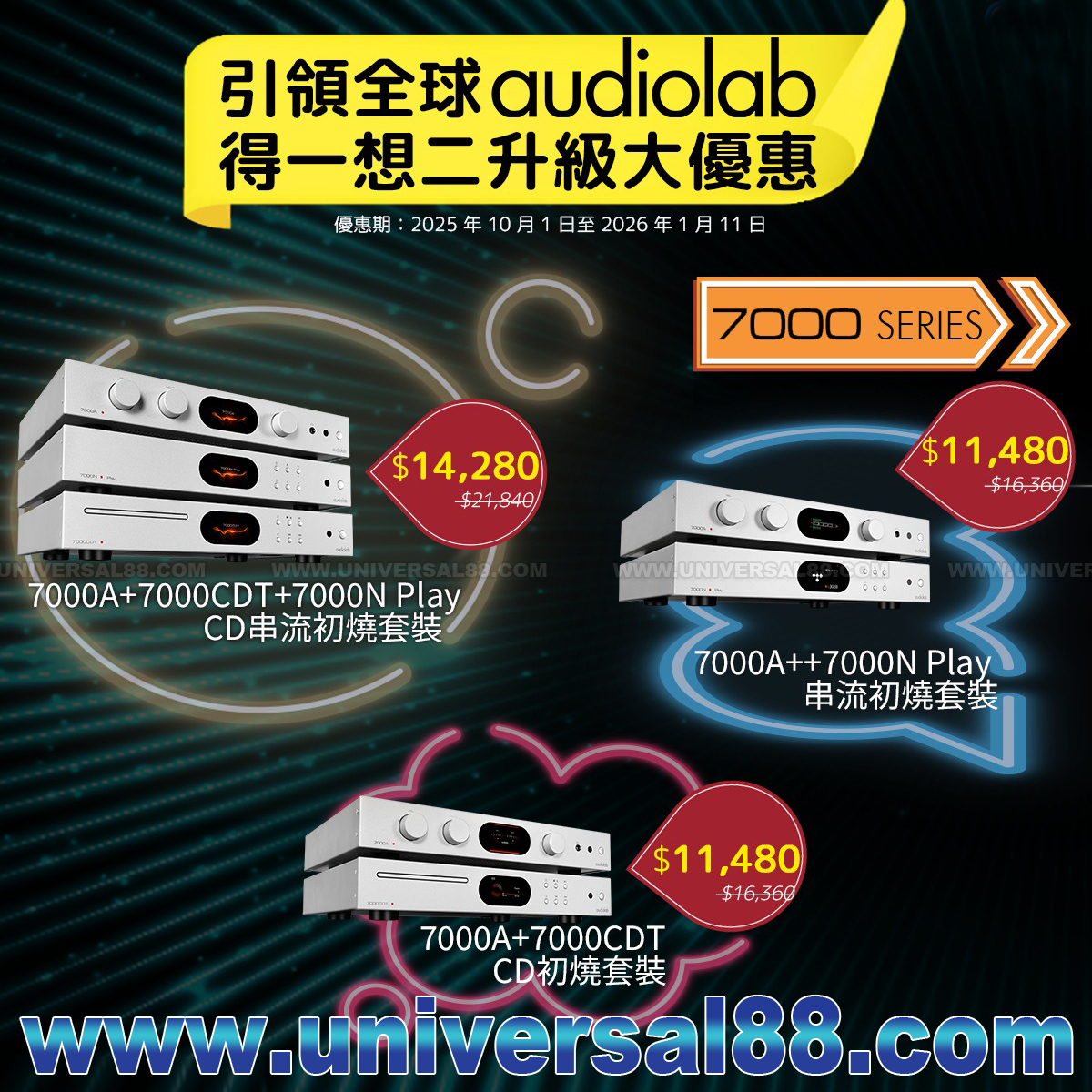 引領全球 Audiolab 得一想二升級大優惠: -[7000A+7000CDT CD初燒套裝] 原價$16,360 特價$11,480.- -[7000A+7000N Play 串流初燒套裝] 原價$16,360 特價$11,480.- -[7000A+7000N Play+7000CDT CD串流初燒套裝] 原價$21,840 特價$14,280.- 優惠期由01/10/2025至15/11/2025止 成為"環球電器"會員可額外享有優惠: Login登入即享額外折扣, 此優惠不能與其他優惠同時使用* 優惠期由01/10/2025至31/10/2025止