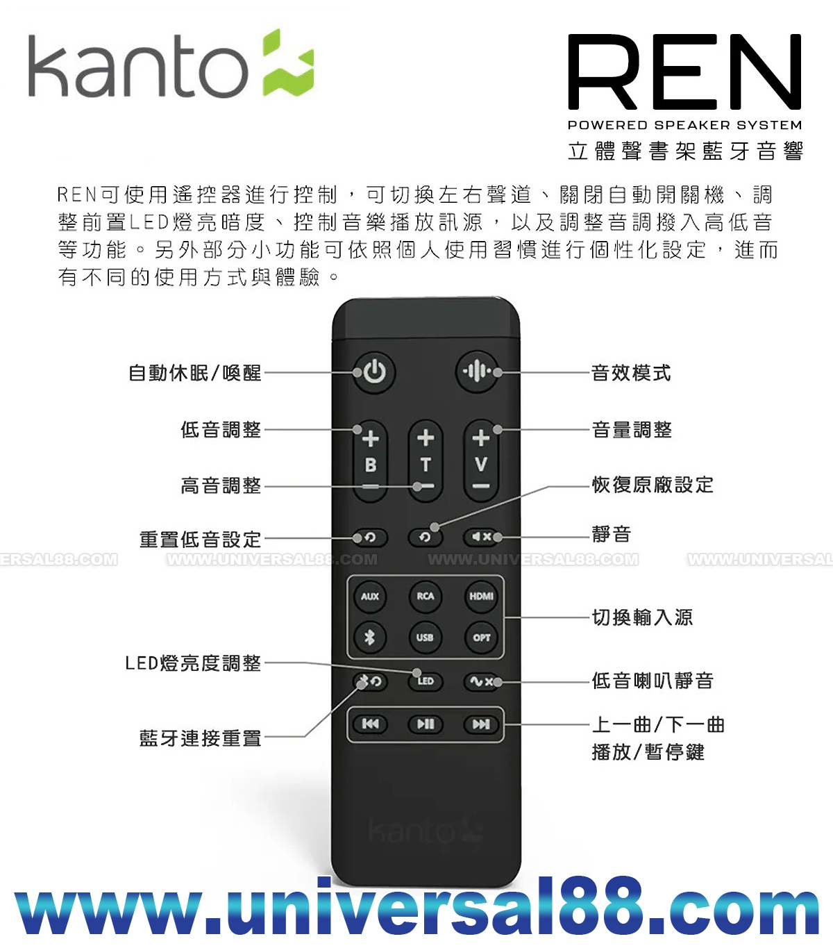 REN可使用遙控器進行控制, 可切換左右聲道,