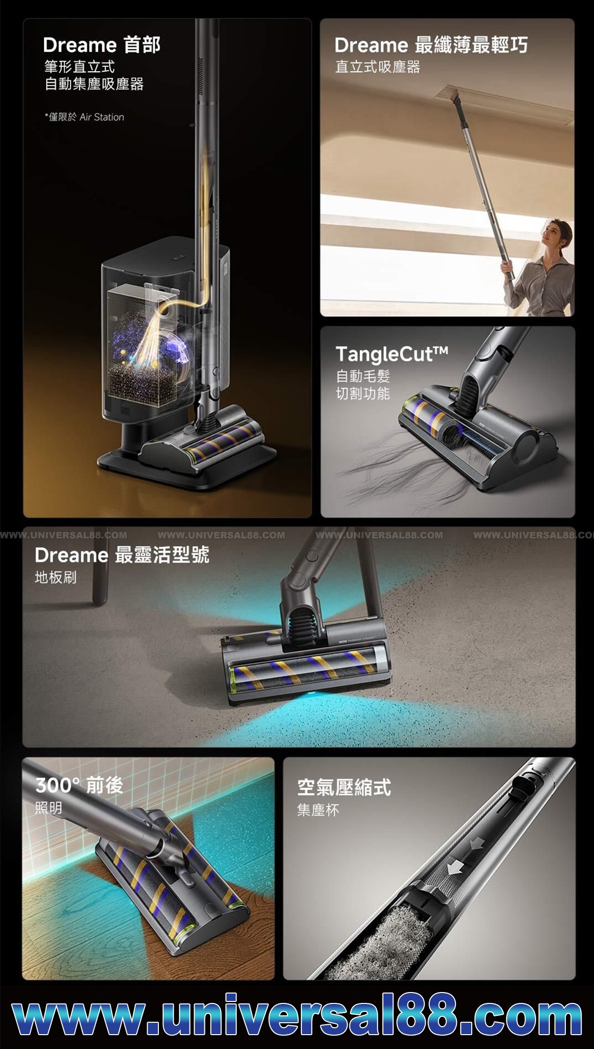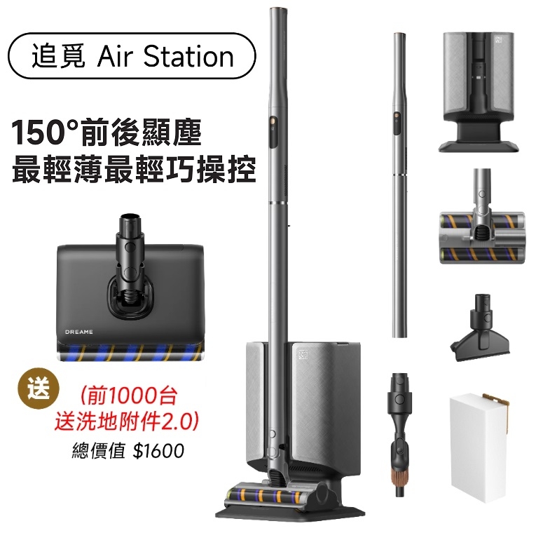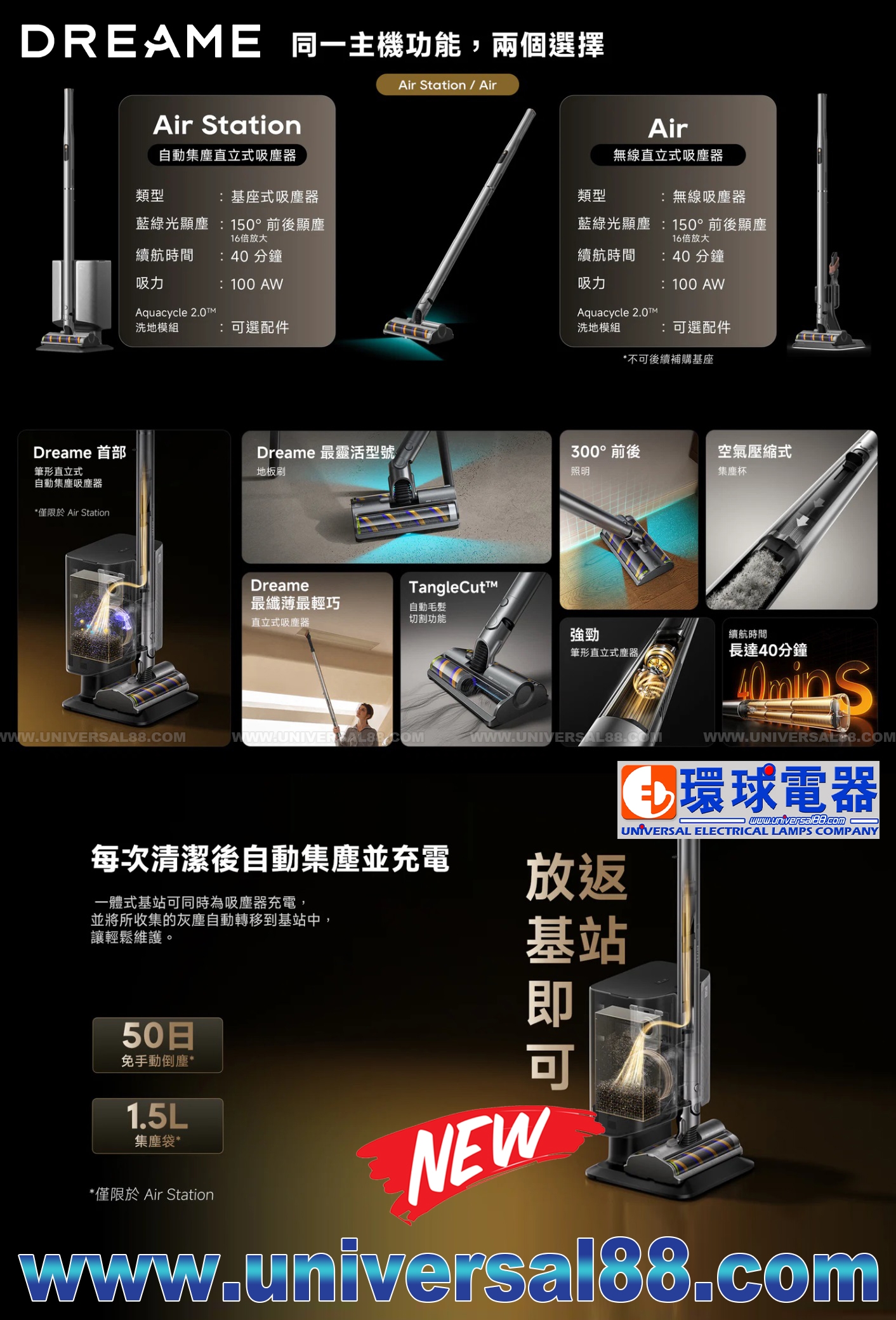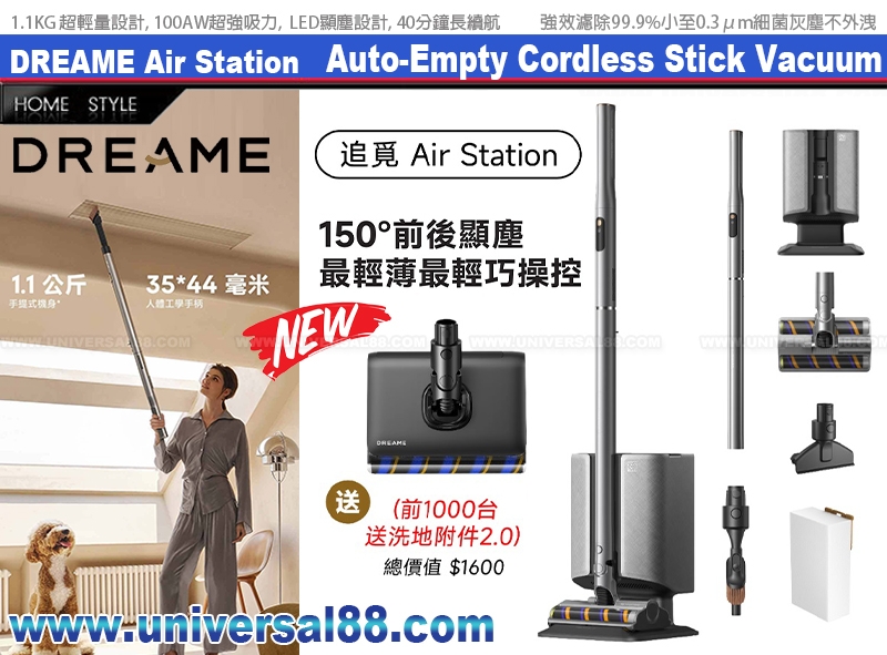 特點: 前後藍綠光顯塵吸頭, 配自動集塵座50天免手集塵, 操作時間40分鐘 原廠12個月保用 追覓Dreame Air Station 2026年纖薄直立式自集塵吸塵機 產品名稱: Dreame Air Station 額定功率: 320W 100AW 吸力 + 140,000RPM 馬達 行業首款: 配自動集塵基站(50天免手集塵) TangleCut™ 毛髮防纏繞技術 頭髮及寵物毛髮問題不再 Dreame以電動雙刀片取代了傳統的防纏繞梳, 輕鬆梳理滾刷上的纏結毛髮 HEPA濾網+旋風濾網+金屬網濾網 99.99%過濾效率 0.3µm顆粒過濾 150°度前後藍綠光顯塵(16倍放大) 1.1kg* 筆型 機身設計 99.99%* 過濾效率 ≥ 0.3µm 顆粒過濾 40min長續航, 配備6顆 2000mAh電池組 AquaCycle™ 2.0 洗地組件 (另購*) 相容濕式清潔, 刮擦及擦洗, 提供強力清潔效果 三區固液分離系統有效防止異味產生 320ml污水箱 / 400ml清水箱 / 固體碎屑盒 淋浴式8孔噴頭, 瞬間軟化乾燥頑固污漬 首款雙滾刷:* 支援360°度雙向旋轉, 絲滑轉向及300°度前後照明 每次潔淨後自動集塵及充電, 方便快捷, 免手動倒塵達50日 LED超清顯示 基站抗菌保護: 等離子技術可清除99.99%細菌 *僅限Air Station 吸力: 100AW 額定功率: 320W 電池容量: 6 x 2,000mAh 運行時間: 40分鐘 充電時間: 4h小時 充電電壓: **.0V 塵杯容量: 0.16L 塵塵袋容量: 1.50L 耗電量: 電壓: 100~240V 50/60Hz 尺寸: W149 / H1200 / D241 mm (主機尺寸) 尺寸: W35 / H*** / D44 mm (主機尺寸) 尺寸: W326 / H326 / D648 mm (包裝尺寸) 重量: 1.1kg (主機重量) 重量: 8.8 kg (包裝重量) 跟機附送5件配件: 包括自動集塵基站(附集塵袋, TangleCut雙滾刷 組合式吸頭 / 備用集塵袋 / 寬型軟毛吸頭 首1,000名送 AquaCycle 2.0吸力洗地頭$1,199.- 送洗地附件2.0, 總值$1,600.- (送完即止) 優惠由15/04/2026至15/05/2026止 DREAME 快閃購物節: 優惠期由15/04/2026至15/05/2026止