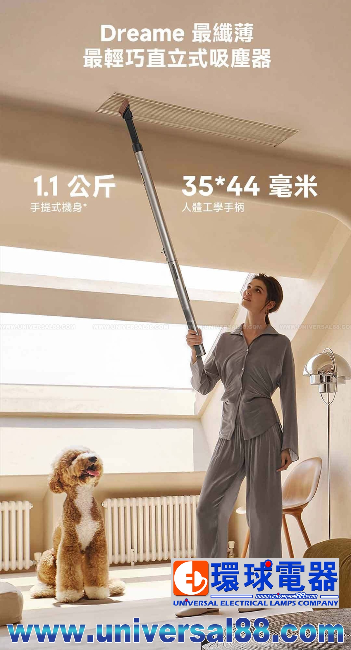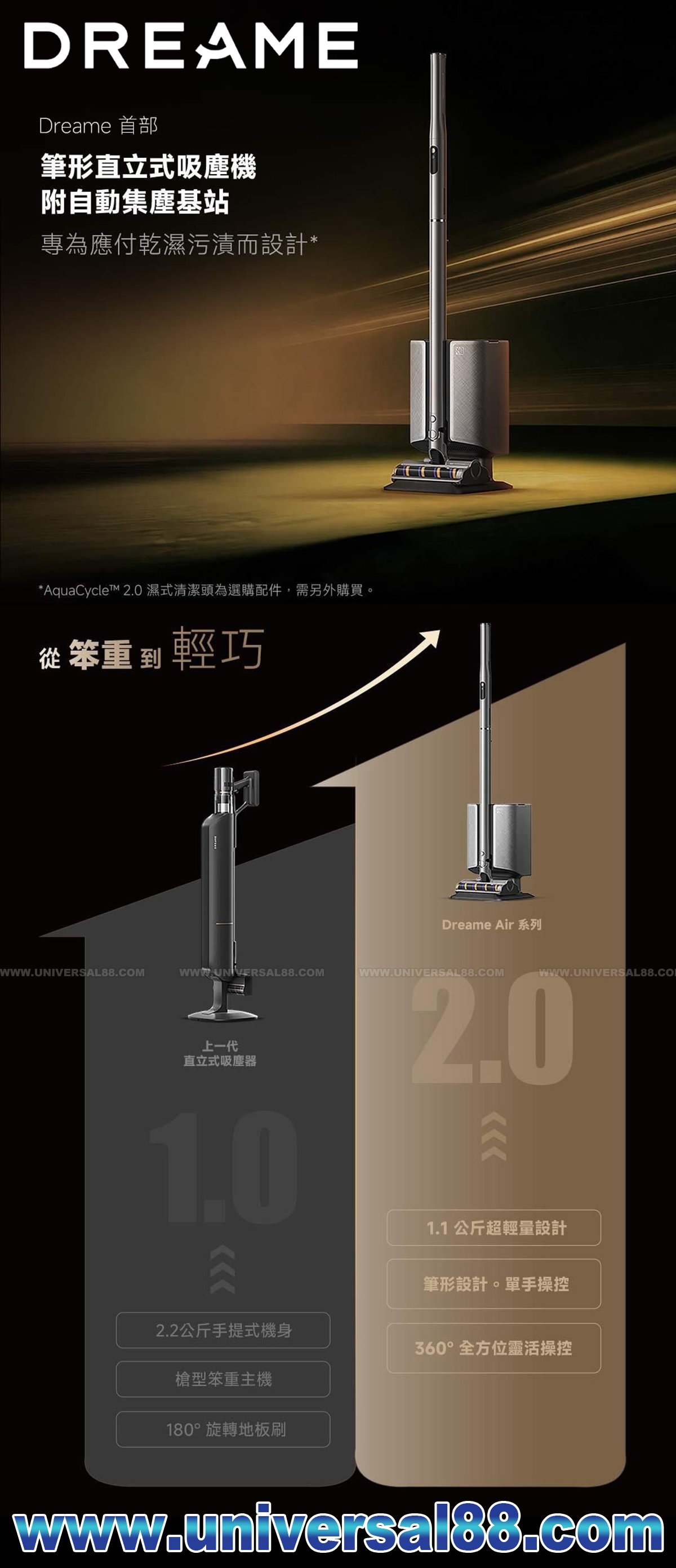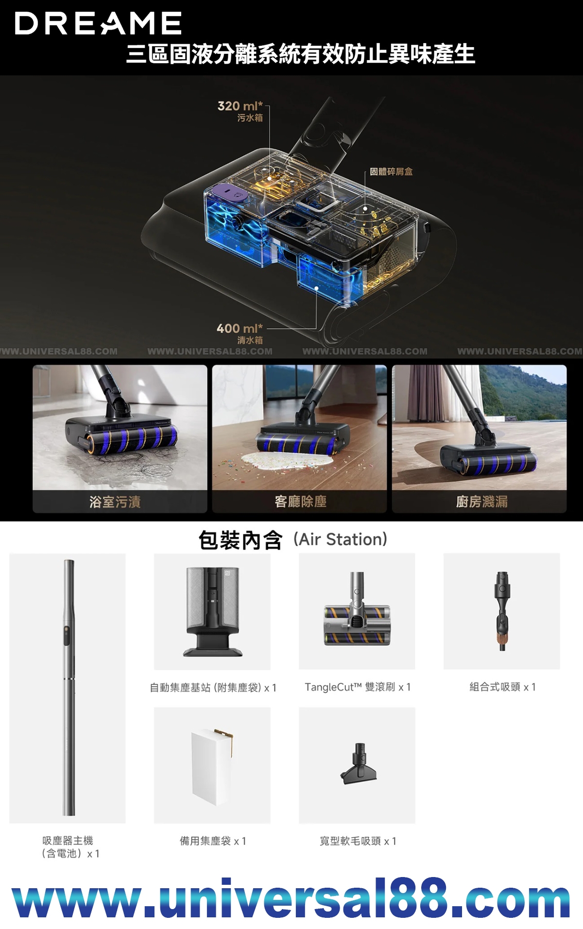 特點: 前後藍綠光顯塵吸頭, 配自動集塵座50天免手集塵, 操作時間40分鐘 原廠12個月保用 追覓Dreame Air Station 2026年纖薄直立式自集塵吸塵機 產品名稱: Dreame Air Station 額定功率: 320W 100AW 吸力 + 140,000RPM 馬達 行業首款: 配自動集塵基站(50天免手集塵) TangleCut™ 毛髮防纏繞技術 頭髮及寵物毛髮問題不再 Dreame以電動雙刀片取代了傳統的防纏繞梳, 輕鬆梳理滾刷上的纏結毛髮 HEPA濾網+旋風濾網+金屬網濾網 99.99%過濾效率 0.3µm顆粒過濾 150°度前後藍綠光顯塵(16倍放大) 1.1kg* 筆型 機身設計 99.99%* 過濾效率 ≥ 0.3µm 顆粒過濾 40min長續航, 配備6顆 2000mAh電池組 AquaCycle™ 2.0 洗地組件 (另購*) 相容濕式清潔, 刮擦及擦洗, 提供強力清潔效果 三區固液分離系統有效防止異味產生 320ml污水箱 / 400ml清水箱 / 固體碎屑盒 淋浴式8孔噴頭, 瞬間軟化乾燥頑固污漬 首款雙滾刷:* 支援360°度雙向旋轉, 絲滑轉向及300°度前後照明 每次潔淨後自動集塵及充電, 方便快捷, 免手動倒塵達50日 LED超清顯示 基站抗菌保護: 等離子技術可清除99.99%細菌 *僅限Air Station 吸力: 100AW 額定功率: 320W 電池容量: 6 x 2,000mAh 運行時間: 40分鐘 充電時間: 4h小時 充電電壓: **.0V 塵杯容量: 0.16L 塵塵袋容量: 1.50L 耗電量: 電壓: 100~240V 50/60Hz 尺寸: W149 / H1200 / D241 mm (主機尺寸) 尺寸: W35 / H*** / D44 mm (主機尺寸) 尺寸: W326 / H326 / D648 mm (包裝尺寸) 重量: 1.1kg (主機重量) 重量: 8.8 kg (包裝重量) 跟機附送5件配件: 包括自動集塵基站(附集塵袋, TangleCut雙滾刷 組合式吸頭 / 備用集塵袋 / 寬型軟毛吸頭 首1,000名送 AquaCycle 2.0吸力洗地頭$1,199.- 送洗地附件2.0, 總值$1,600.- (送完即止) 優惠由15/04/2026至15/05/2026止 DREAME 快閃購物節: 優惠期由15/04/2026至15/05/2026止