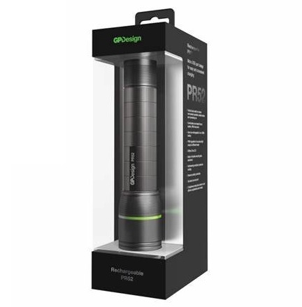 特點: 對焦裝置連對焦鎖, 防水IPX4 任何工作環境無受限制 原廠一年保用 超霸GP PR52 多功能充電式電筒 紅點設計大獎reddot design award winner 2017 戰術雙切換開關適合單手控制 設爆閃及短暫開功能 舒適單手操控對焦裝置連對焦鎖 PWM調節以達至不同程度的精確光輸出 採用 Cree LED 使用航空級鋁材製造 氧化保護塗層 電池反極保護 站立式防滾動設計 3 種照明模式及爆閃適合不同應用和需要 雙層加厚型鋁合, 堅固筒身, 無具碾壓 採用高透光鋼化玻璃鏡片 三個照明光亮度: (5% / 50% / 100%) 適合戶外及全天侯日常活動用 站立式/防滾動: 站立式及防滾動 GP PR52 Micro USB port design for easy and convenient charging ANSI FL1 Standard GP Design enhances life witj authentic innvoations for people who appreciate user-centered design & smart perfotmance 光亮度: 450~22 Lumens 光射程: 160m 米 防撞設計: 1.5m米 操作時間: 43Hr 小時 使用時間: 最光: 100% (2Hr小時45min分鐘) 中度: 50% (5Hr小時) 最弱: 5% (43Hr小時) 防水等級IP: IPX4 電池: 鋰離子18650充電池1枚(可更換式) 光源: Cree LED 尺寸: L166 x 35 mm (燈身直徑27mm) 尺寸: W65 / H210 / D93 mm (包裝尺寸) 重量: 143g ±7g