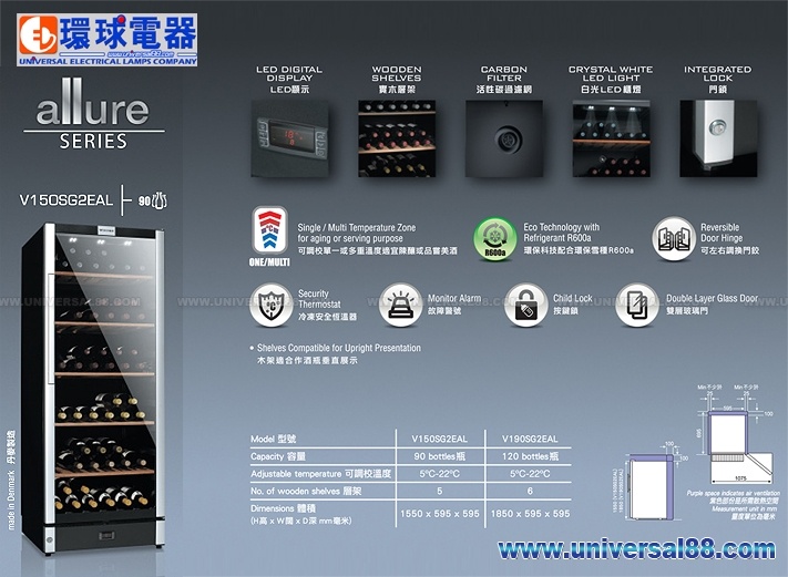 特點: 自動白燈LED, 雙層玻璃設計, 6層木製層架,可調校單一或多重溫區選擇