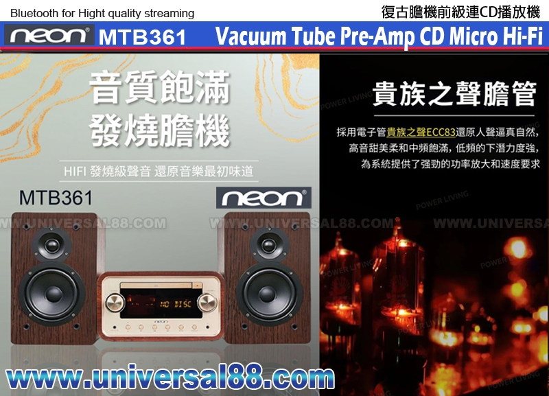 原廠一年保用 NEON MTB361 USB/CD高級膽機音響Hi-Fi 發燒級膽管超靚聲, 前膽後石設計 採用3組獨立真空膽前級電路設計,