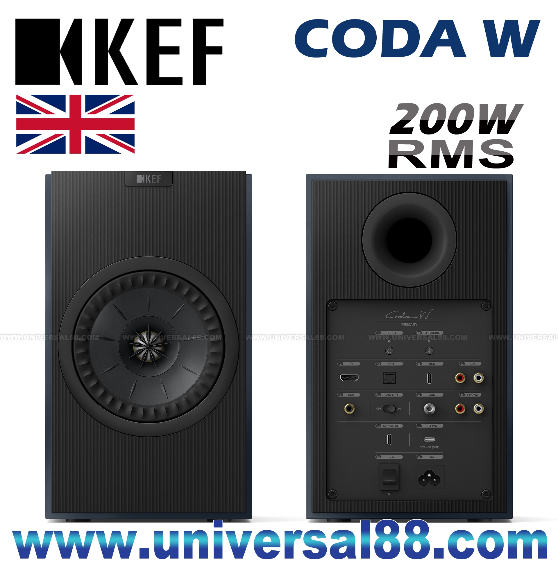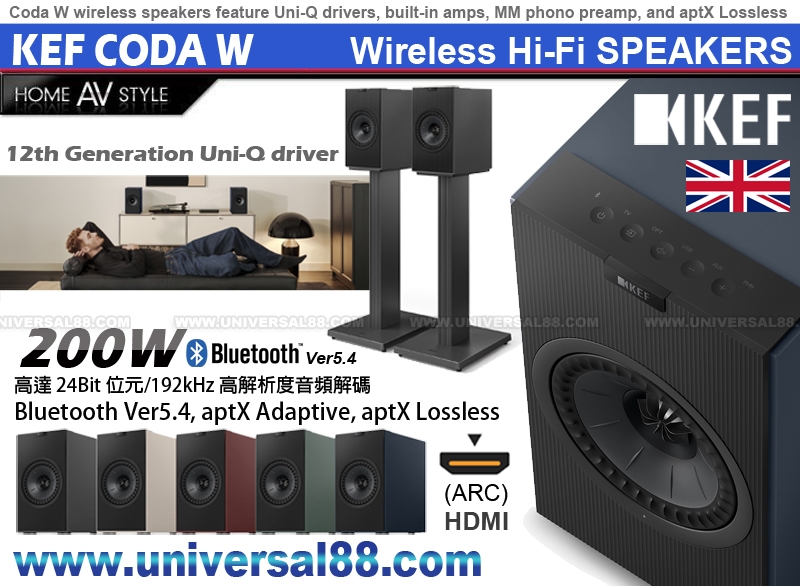 特點: 高清藍牙aptX Adaptive, 提供高品質, 低延遲的音頻, 實現無縫聆聽 原廠三年保用 2025年10月KEF Coda W 高級 Hi-Fi 書架喇叭 為了讓 CODA W 能夠傳送出精確, 不失真的聲音, 和專業級的監聽喇叭一樣 XCoda W每邊揚聲器皆內建雙D類擴音效大器器 內建雙D類放大器 擴大機: 高音30瓦, 低音70瓦, D類擴音機 最大聲壓級SPL: 102dB @1m 採用Uni-Q 同軸共點單元 130mm中低音x1 25mm高音x1 於85dB/1m 頻響範圍(- 6dB): 38Hz~20kHz 於85dB/1m 頻響範圍(±3dB): 41Hz~20kHz Coda W 揚聲器的核心是一個 5.25" 12 代 Uni-Q 同軸共點單元, 帶來細膩的音質 Coda W 提供 200W 瓦的總系統功率: 主揚聲器和副揚聲器都配備了用於高音揚聲器和低音 Music Integrity Engine (MIE): KEF 專有 DSP 算法增強了聲音的完整性和細節 減少播放干擾的DAC數類轉換晶片, 帶來細膩的音質 揚聲器的專用功放, 讓緊湊箱體迸發充盈空間的震撼音效 為了進一步提高性能,KEF 的Music Integrity Engine (一套專有的 DSP 演算法) 專門針對 Coda W 進行了調整, 透過提供卓越的聲音完整性、細節和準確性來增強整體性能 Coda W 利用高清藍牙 5.4 aptX Adaptive, 提供高品質, 低延遲的音頻, 實現無縫聆聽、卓越的清晰度和可靠的連接 aptX Lossless解碼器支援高達 16Bit/44.1 kHz CD品質分辨率, 使揚聲器能夠以出色的清晰度和動態範圍再現聲音, 同時保留 您喜愛音樂的原始細節 與黑膠唱機, 電視等連接, 即插即用 Coda W 專為無縫融入各種生活方式而設計, 提供無線串流媒體 及多功能有線連接的自由 它相容於現代與經典音源, 成為高保真音質的核心樞紐 為了獲得現代的聆聽體驗, Coda W 讓您可以從手機, 平板電腦或筆記型電腦無線傳輸音樂 藍牙連接確保簡單, 方便的配對過程以及即時播放音訊的自由 Coda W 從容演繹經典模擬音質: 支援黑膠唱機直連, 內建唱頭擴大機可直接適配大多數黑 膠唱機, 無需額外設備 對於配備內建唱頭擴大機的黑膠唱機: Coda W 也支援 RCA 輸入, 為不同配置提供靈活適配方案! 這讓聆聽者能重新發現黑膠唱片收藏中那份本真的溫暖感與 深邃音韻 透過HDMI ARC連接, Coda W可以輕鬆連接到您的電視, 讓家庭劇院系統的設定變得簡單 配備USB Type-C 連接埠輸入, 可提升您的電腦音訊並支援 高達 24Bit 位元/192kHz 的高解析度音頻解碼 為了進一步提高靈活性,一系列附加輸入 (包括 RCA 和光纖) 可容納 CD 播放器、藍光播放器和遊戲機等訊號源, 使 Coda W 成為真正的多功能音訊中心 對於追求深沉低音的用戶, Coda W 配備專用超低音揚聲器輸出, 可輕鬆連接相容的 KEF 超低音揚聲器 這非常適合提升您的家庭劇院觀影體驗, 或透過擴展的低頻 響應豐富音樂層次 為了獲得更大的擺放靈活性, 可選的 KW1 無線超低音揚聲器 適配器套件可實現簡潔的無線連接,告別線雜亂 拍尖輕觸, 即刻掌控: Coda W 專為無縫操作而設計, 頂部面板按鈕直觀易用, 可快速存取基本功能和切換音 即插即用, 適用於幾乎所有黑膠唱機 (帶集成唱機前置功放的 RCA唱機) 藍牙 5.4 aptX Adaptive帶來高品質低延遲音訊 aptX Lossless™ 支援透過藍牙實現高達 16 位元/44.1kHz 的 CD 級分辨率 豐富的連線功能,適用於電視, 桌上型電腦等設 備(USB-C, HDMI ARC, 光纖, RCA & 低音喇叭輸出 選購8公長 C-Link 揚聲器連接線, 方便靈活擺放揚聲器 SQ1 腳架作為單獨配件提供: 提供五種顏色可選:復古紅, 鎳灰, 森綠, 午夜藍及深鈦 Coda W 專為無縫操作而設計, 頂部面板按鈕直觀易用, 可快速存取基本功能和切換音源 Coda W 以其簡潔的直線線條和精簡的細節, 體現了極簡 主義的優雅,其經典的外形將復古魅力與現代精緻融為一體 它為客廳、家庭工作室、書房或閱讀角落帶來低調優雅的氣質, 為每個空間增添精緻風格 Coda W 兼顧視覺和諧與聲學性能, 提供五種精選飾面: 復古紅、鎳灰、森綠、午夜藍和深鈦 每種飾面都經過精心挑選,能夠自然融入各種室內裝飾, 同時展現獨特的風格 標配 3 公尺長揚聲器連接線 為了獲得更大的靈活性, Coda W 還相容於可選的8公尺長 C-Link 主副音響連接線, 可依房間配置客製化揚聲器擺放位置 Coda W 可與可選的 SQ1腳架搭配使用,後者為抬高擺放位置 和理想聆聽高度提供了穩定的平台 Bluetooth Ver5.4, aptX Adaptive, aptX Lossless 輸入音源解析度光纖可高達96kHz/24bit USB Type C高達192kHz/24bit HDMI可高達1.411 Mbps PCM GND LIFT (Off/Off) 1組HDMI輸入 (ARC) 1組光纖輸入 (Optical) 1組RCA音頻輸入 (AUX) 1組RCA唱盤輸入 (Phono) 1組USB Type-C音頻端子 (DAC) 1組USB Type-C電源j輸出 (5V 2A Out) 1組USB Type-C喇叭輸出 (30V 3A Out) 1組超低音輸出 (Subwoofer Out) 1組GND地線端子 全能遙控器 (Remote Control) 電壓: 100~240V 50/60Hz 200W Standby <0.5W 尺寸: W168 / H285 / D268 mm (主機尺寸) 尺寸: W500 / H360 / D365 mm (包裝尺寸) 重量: 11.3 kg (主機重量) 重量: 14.6 kg (包裝重量) 顏色: 午夜藍(Midnight Blue) 另有: 復古紅(Vintage Burgundy) / 灰白(Nickel Grey) / 森綠(Moss Green) / 深鈦(Dark Titanium) 可供選擇 現凡登記KEF帳戶後即可延長1年保用, 達3年保用 加送4K HDMI Cable Ver2.0, 價值$498.- 送$500.-環球電器現金券* 或 24個月免息分期* 優惠期由01/12/2025至25/12/2025止 成為"環球電器"會員可額外享有優惠: Login登入即享額外折扣, 此優惠不能與其他優惠同時使用* 詳情請親臨本店參觀及試用系統操作示範