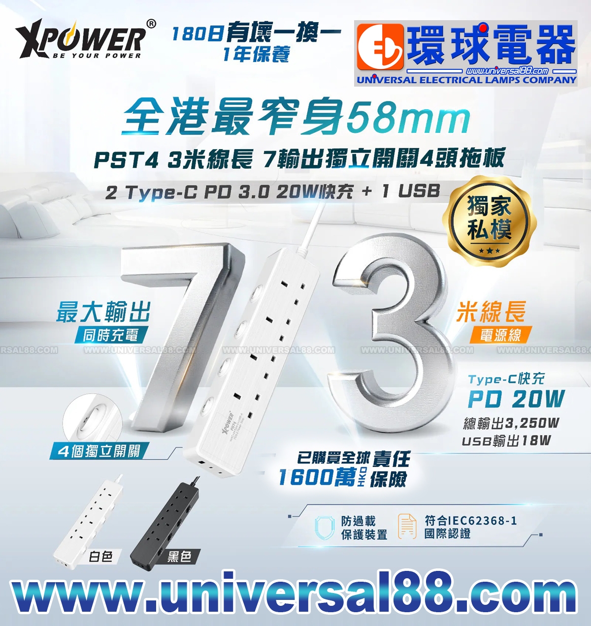 特點: 4組USB插座, 3米尼龍物料電綫, Smart IC保護系統