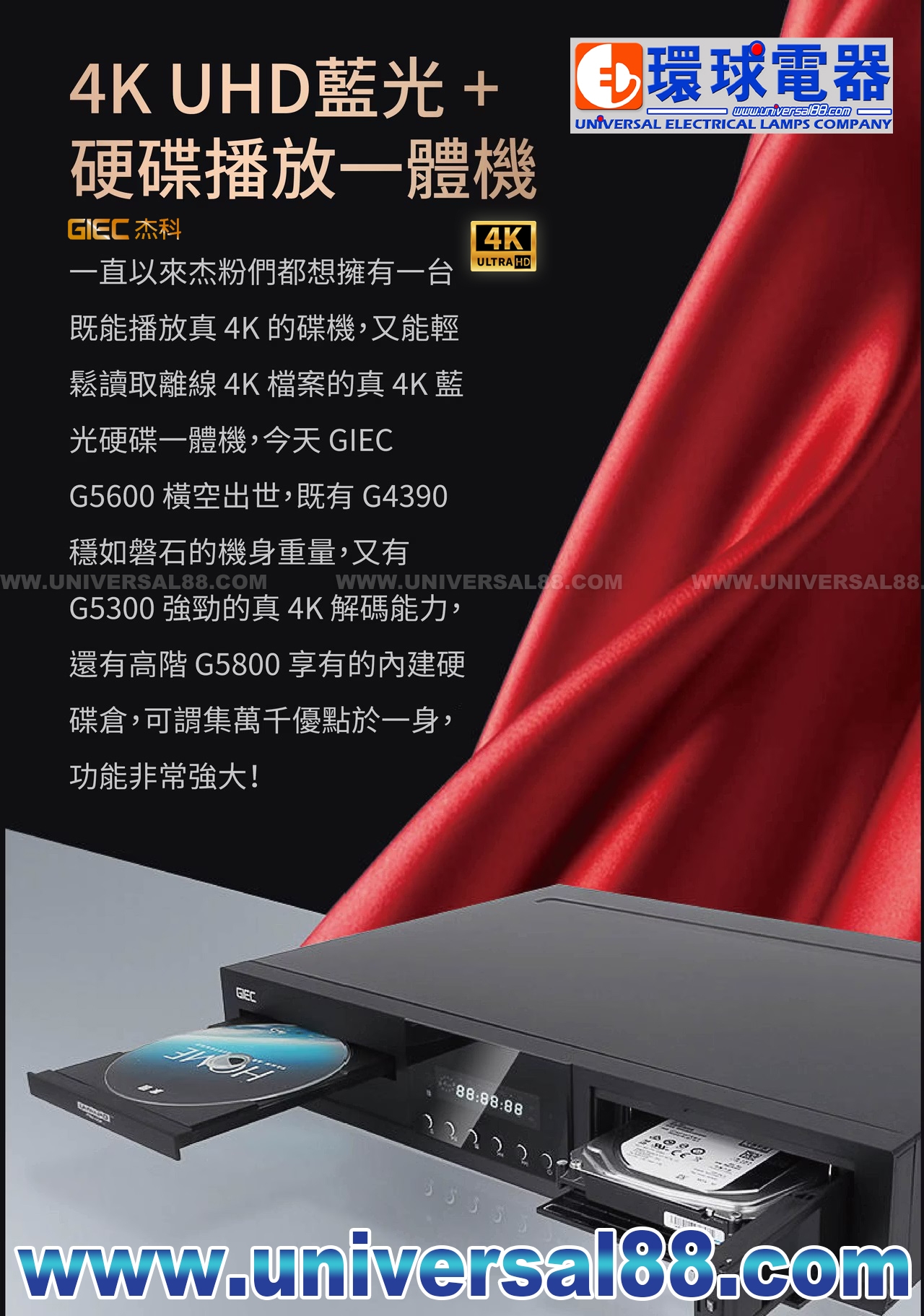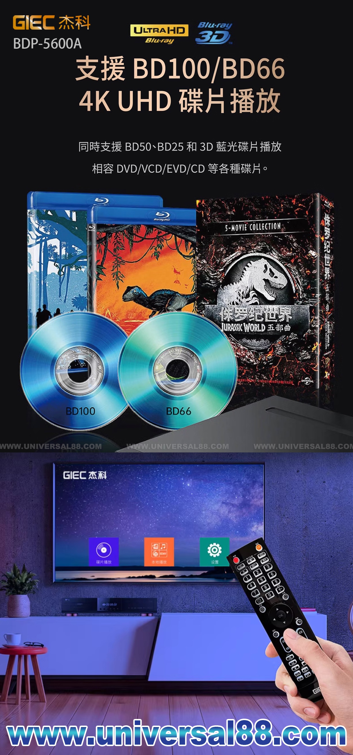 除了UHD藍光 (4K光盤) 以外, G5600A還支持外接U盤、