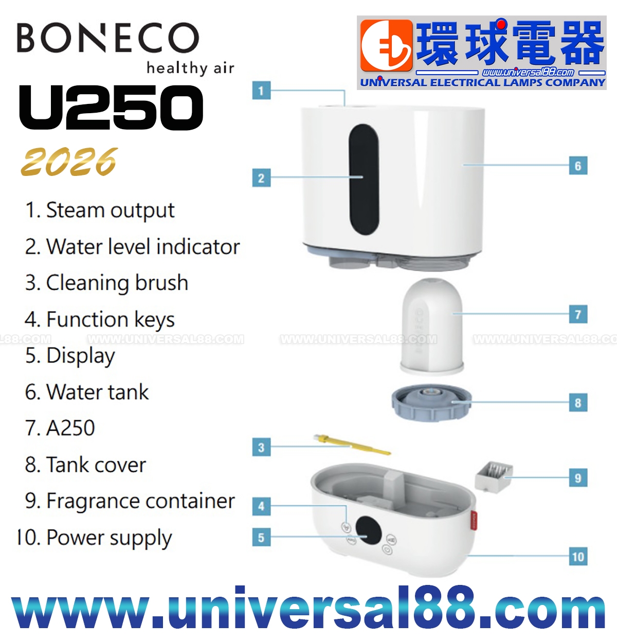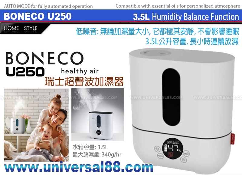 原廠一年保用 2026年瑞士 BONECO U250 超聲波冷霧加濕器 BONECO U250 採用小巧細小的設計 適用於任何住宅或辦公環境 BONECO U250 是 BONECO U200 的進化版