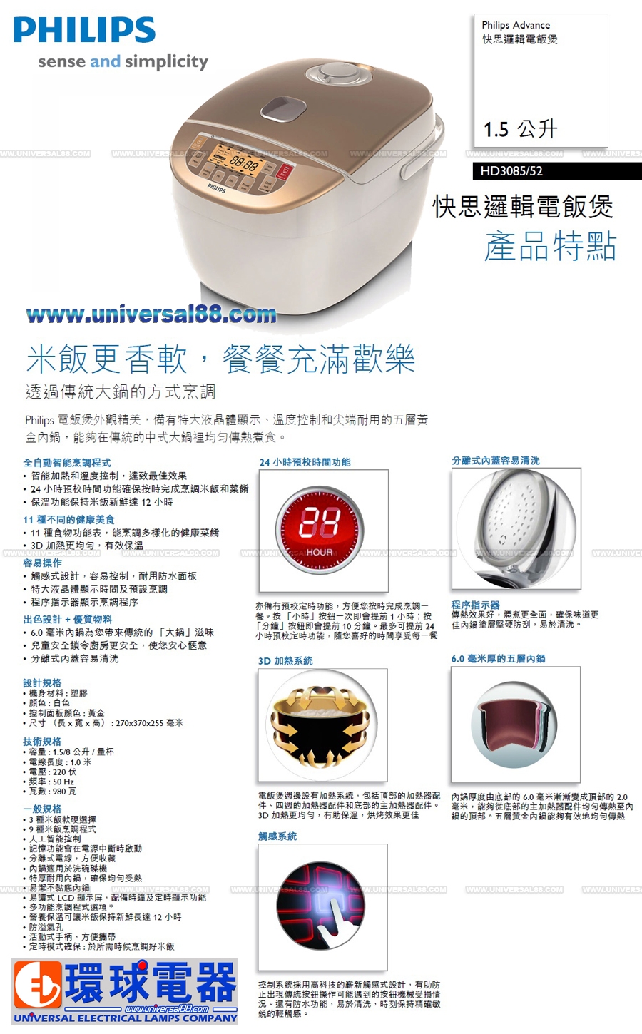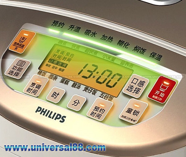 特點: 採用美國Whitford廚具軔用塗層五層瑰黃金內鍋, 3D加熱更均勻, 有效保溫 原廠二年保用 Advance 飛利浦快思邏輯電飯煲 2014年6月全新PHILIPS HD3085/52 Rice Cooker 24hr 小時預校時間功能確保按時完成烹調米飯和菜餚 亦備有預校定時功能, 方便您按時完成烹調一餐 按「小時」按鈕一次即會提前1hr小時 按「分鐘」按鈕即會提前10min分鐘 最多可提前24hr小時預校定時功能, 隨您喜好的時間享受每一餐 採用美國Whitford廚具專用塗層五層瑰黃金內鍋, 能夠在傳統的中式大鍋裡均勻 傳熱煮食全自動智能烹調程 保溫功能保持米飯新鮮達12hr小時 24hr小時預校時間功能確保按時完成烹調米飯和菜餚 智能加熱和溫度控制, 達致最佳效果 11種不同的健康美食 3D加熱更均勻, 有效保溫-電飯煲週邊設有加熱系統, 包括頂部的加熱器配件, 四週的加熱器配件和 底部的主加熱器配件 11種食物功能表, 能烹調多樣化的健康菜餚 包括標準烹調: 快煮 / 極速快煮 / 少米量 / 蒸煮 / 煲粥 / 壽司米 / 焗蛋糕 / 煲仔飯和什錦米 智能烹調程序助您輕鬆烹調美味香軟的米飯 特大液晶體顯示時間及預設烹調 程序指示器顯示烹調程序 觸感式設計, 容易控制, 耐用防水面板 控制系統採用高科技的嶄新觸感式設計, 有助防止出現傳統按鈕操作可能遇到的按鈕機械受損情況 還有防水功能, 易於清洗, 時刻保持精確敏銳的輕觸感 6.0毫米內鍋為您帶來傳統的「大鍋」滋味 兒童安全鎖令廚房更安全, 使您安心愜意 按下「兒童安全鎖」按鈕三秒, 即可鎖定控制面板 這樣便能鎖定操作面板, 確保兒童在烹調期間不會誤用電飯煲, 再按下「兒童安全鎖」按鈕三秒即可解除鎖定 分離式內蓋容易清洗 機身材料: 塑膠 容量: 1.5L公升/8量杯 電線長度: 1.0m 米 電壓: 220V 50Hz 瓦數: 980Watts 顏色: 白色控制面板 尺寸: W370 / H255 / D270 mm 顏色: 黃金 附有配件: 抺刀 / 湯勺 / 塑膠蒸架 / 量杯 Accessories: Measuring Cup, Rice Scoop & Steamer