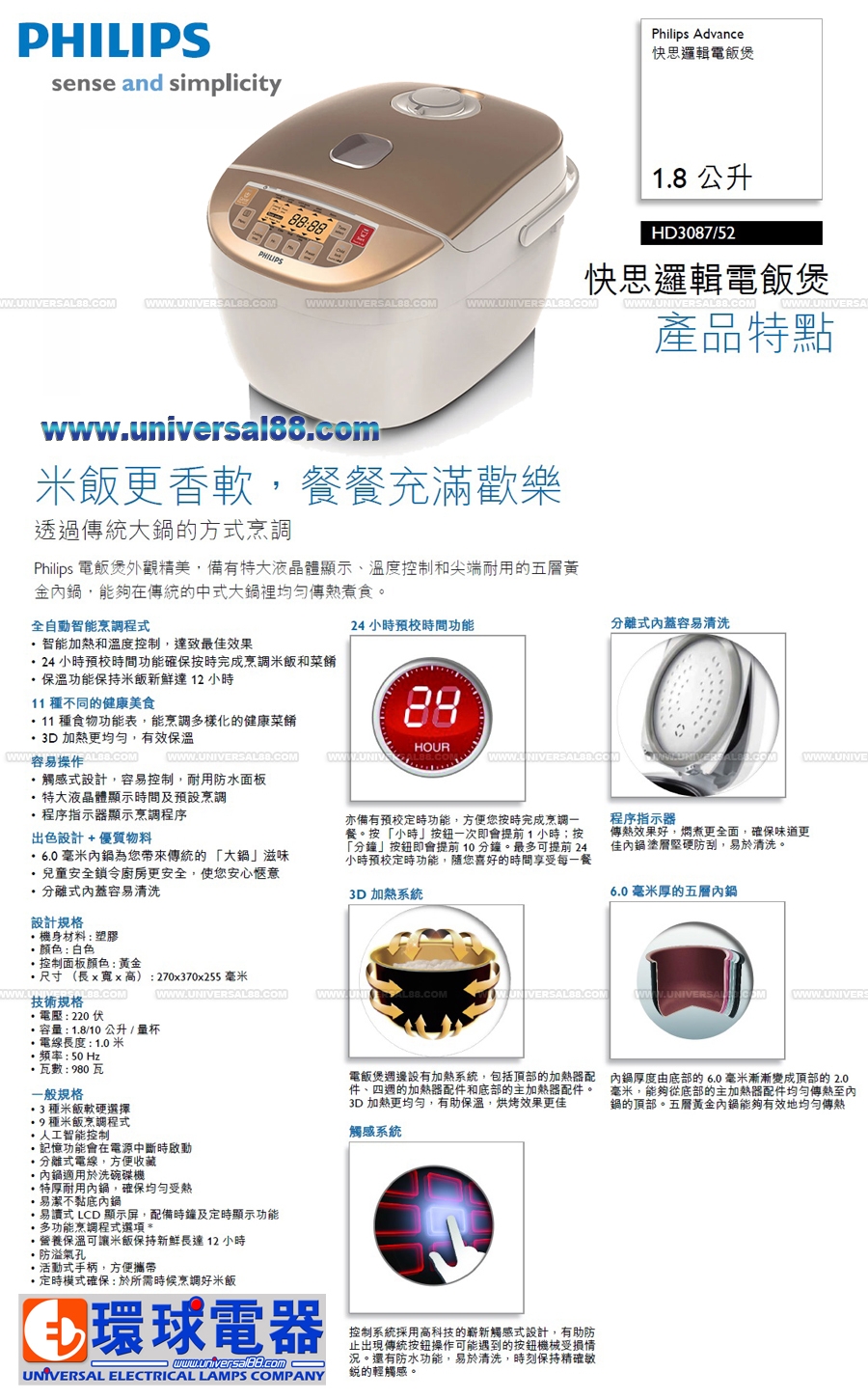 特點: 採用美國Whitford廚具軔用塗層五層瑰黃金內鍋, 3D加熱更均勻, 有效保溫 原廠二年保用 Advance 飛利浦快思邏輯電飯煲 2014年6月全新PHILIPS HD3087/52 Rice Cooker 24hr 小時預校時間功能確保按時完成烹調米飯和菜餚 亦備有預校定時功能, 方便您按時完成烹調一餐 按「小時」按鈕一次即會提前1hr小時 按「分鐘」按鈕即會提前10min分鐘 最多可提前24hr小時預校定時功能, 隨您喜好的時間享受每一餐 採用美國Whitford廚具專用塗層五層瑰黃金內鍋, 能夠在傳統的中式大鍋裡均勻 傳熱煮食全自動智能烹調程式 保溫功能保持米飯新鮮達12hr小時 24hr小時預校時間功能確保按時完成烹調米飯和菜餚 智能加熱和溫度控制, 達致最佳效果 11種不同的健康美食 3D加熱更均勻, 有效保溫-電飯煲週邊設有加熱系統, 包括頂部的加熱器配件, 四週的加熱器配件和 底部的主加熱器配件 11種食物功能表, 能烹調多樣化的健康菜餚 包括標準烹調: 快煮 / 極速快煮 / 少米量 / 蒸煮 / 煲粥 / 壽司米 / 焗蛋糕 / 煲仔飯和什錦米 智能烹調程序助您輕鬆烹調美味香軟的米飯 特大液晶體顯示時間及預設烹調 程序指示器顯示烹調程序 觸感式設計, 容易控制, 耐用防水面板 控制系統採用高科技的嶄新觸感式設計, 有助防止出現傳統按鈕操作可能遇到的按鈕機械受損情況 還有防水功能, 易於清洗, 時刻保持精確敏銳的輕觸感 6.0毫米內鍋為您帶來傳統的「大鍋」滋味 兒童安全鎖令廚房更安全, 使您安心愜意 按下「兒童安全鎖」按鈕三秒, 即可鎖定控制面板 這樣便能鎖定操作面板, 確保兒童在烹調期間不會誤用電飯煲, 再按下「兒童安全鎖」按鈕三秒即可解除鎖定 分離式內蓋容易清洗 機身材料: 塑膠 容量: 1.8L公升/10量杯 電線長度: 1.0m 米 電壓: 220V 50Hz 瓦數: 980Watts 顏色: 白色控制面板 尺寸: W370 / H255 / D270 mm 顏色: 黃金 附有配件: 抺刀 / 湯勺 / 塑膠蒸架 / 量杯 Accessories: Measuring Cup, Rice Scoop & Steamer