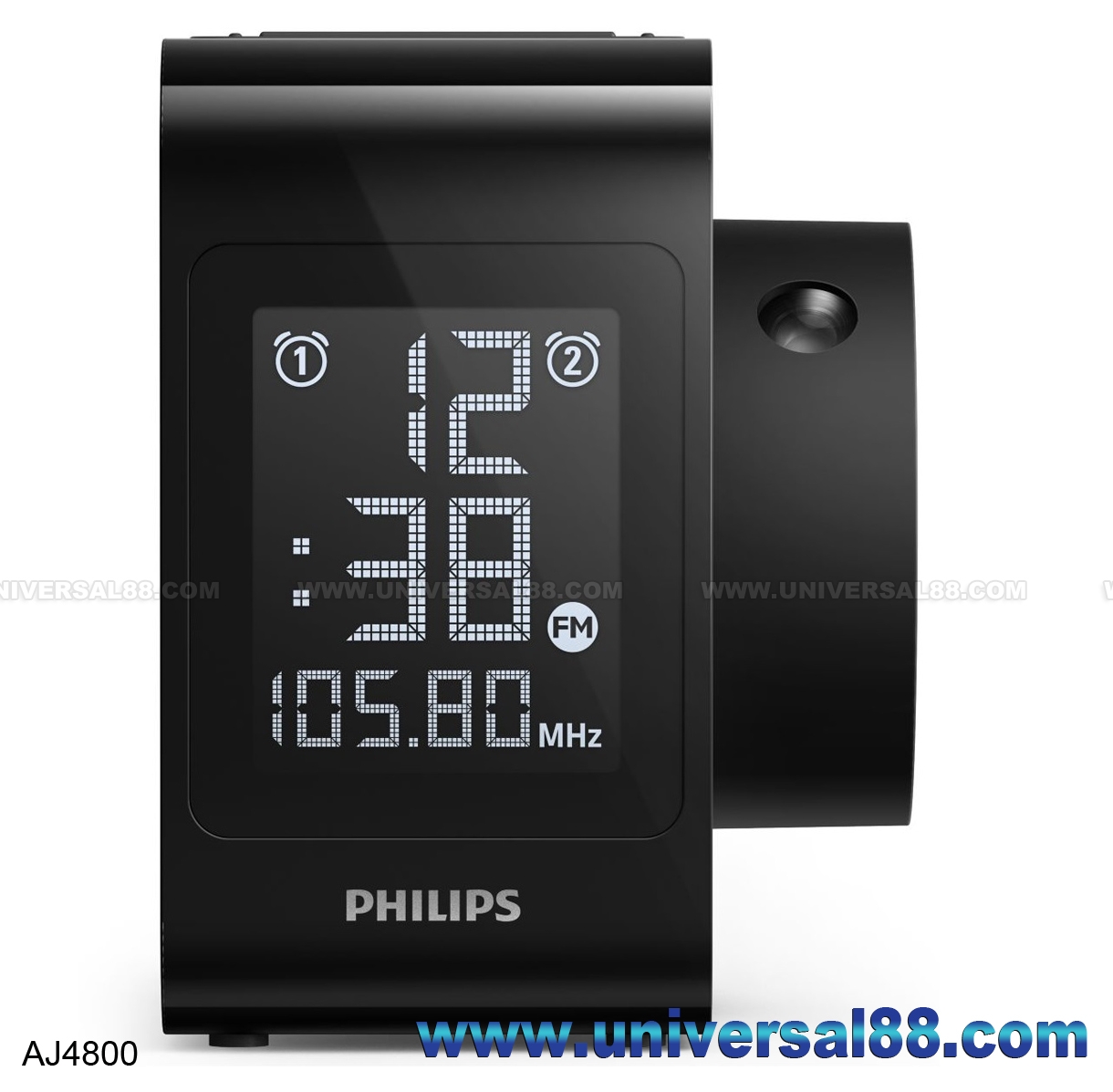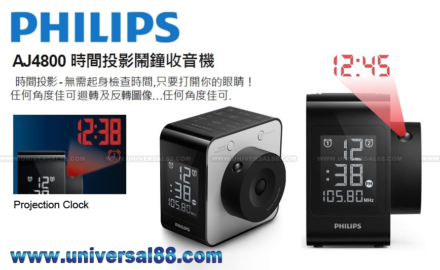 特點: 雙響鬧功能, 配合溫和響鬧, 乾濕電兩用, 迴轉及反轉圖像 原廠一年保用 2016年7月飛利浦AJ4800/12時間投影鬧鐘收音機 時間投影-無需起身檢查時間,只要打開你的眼睛! 任何角度佳可迴轉及反轉圖像…任何角度佳可. 黑底白字LCD 顯示屏 設有預設功能的FM 選台(20Memory) 4段式顯示亮度調較(High/Mid/Low/Off) 雙響鬧時間設定(Dual Alarm) 9 分鐘重複響鬧 定時關機: 15 / 30 / 60 / 90 / 120 分鐘 (Sleep Timer 15~120mins) 24 小時響鬧重設 鬧鐘聲: FM 收音機, 蜂鳴器 投射時鐘模式: 電池: 10秒投射時間 長電: 長時間投射時間 電源類型: AC電源 / 電池(4xAA)兩用 尺寸: W76.4 / H103.5 / D100mm 0. 27kg (主機尺寸) 尺寸: W210 / H98 / D131mm 0.363kg (包裝尺寸) 顏色: 黑色 (Color Black)