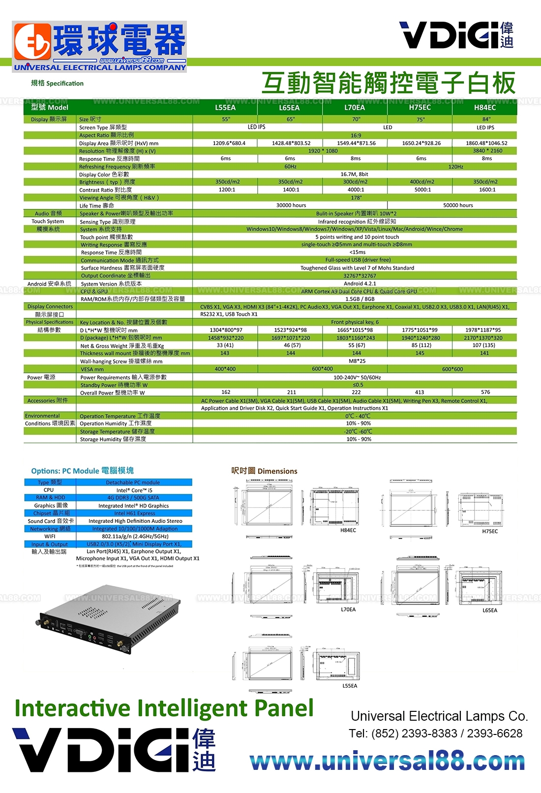 特點: 雙系統均可獨立實現白板書寫和多種格式的多媒體, 採用4mm強化玻璃 原廠三年全機保用 偉迪 L55EA 55"互動智能觸控電子白板IPS LED屏幕 2017年10月全新VDiGi Interactive Intelligent Panel Make teaching & meeting more easy & fun 屏幕尺寸: 55" 屏幕尺寸: 1650.24 x 928.26 mm 解像度: 1920x1080 反應時間: 6ms 刷新頻率: 60Hz 光亮度: 350cd/m2 對比度: 1,200:1 壽命: 30,000Hr 小時 雙核-雙系統設計Dual Core, Dual OS Design Windows, Android 雙系統一髒設計, 深度融合, 數據互傳共享 雙系統均可獨立實現白板書寫和多種格式的多媒體, 實現雙重保障 機身設計一絲不苟(Design is Attention to detail) A-Grade屏幕, 防反光設計, 於日光照下, 仍可正常觀見 表層採用4mm強化玻璃(Mohs7)* 不易刮花 鋁合金拉絲外框, 超薄超窄, 配合圓角設計, 堅固耐用, 安全貼心 在沒有PC情況下, 可於Android介面的白板上隨心書寫, 批注與截屏 內置喇叭: 10Watts+10Watts (Built-in Speaker) 識別處理: 紅外線認知(Infrared recognition) 書寫速度雙倍提升, 支援同時5點書寫及10點觸控, 可多人同時書寫 系統支援: Windows10 / Windows8 / Windows7 / Windows / XP / Vista / Linus / Mac / Android / Wince / Chrome 觸控點數: 5 Points writing and 10 Points touch 書寫反應: <15ms 通訊方式: Full-Speed USB (driver free) 書寫屏表面硬度 Toughened Glass with Level 7 of Mohs Standard 座標輸出: 32767x32767 Android系統: 4.2.1 Ram/rom 系統內存1.5GB/內部儲存8GB USB3.0技術, 支援USB手拍.外置硬碟, 滑鼠及攝像鏡頭 HDMI, VGA插頭, 支援高清設備及電腦 低輻射, 比歐洲標準攻低 教育系統無縫智能觸控白板 Smart board互動電子白板、教學或會議用, 提供工程安裝服務 3組HDMI高清輸入 1組RCA影音輸入(CVBS) 1組VGA電腦輸入(PC Video Input) 1組VGA音頻輸入(PC Audio Input) 1組VGA電腦輸出(PC Video Output) 1組同軸輸出(Digital Coaxial Output) 4組USB端子(USB 2.0 x3 / USB 3.0 x1) 1組USB Touch輸入 1組RS232端子輸入 1組LAN太網端子(RJ45) 工作溫度: 0°C~40°C 工作濕度: 10%~90% 儲存溫度: -20°C~60°C 儲存濕度: 10%~90% Wall-hanging Screw M8x25mm 掛牆架支援VESA: 400x400mm 電壓: 100~240V 50/60Hz 162W Standbt 0.5W 尺寸: W1304 / H800 / D 97 mm (主機尺寸) 尺寸: W1304 / H800 / D143 mm (掛牆後厚度) 尺寸: W1458 / H932 / D220 mm (包裝尺寸) 淨量: 33.0 kg 毛重: 41.0 kg 附有配件: Power cable 3M / VGA Cable 5M / USB Cable 5M / Audio Cable 5M / Writing Pen x 3 / Remote Control