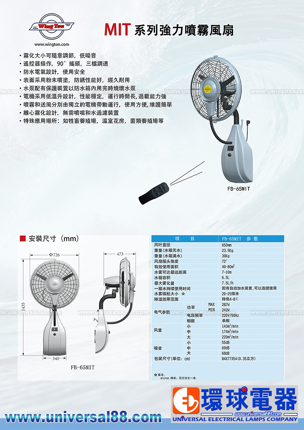 原廠一年保用 榮通 FB65-MIT 牛角噴霧掛牆扇 MIT 系列強力噴霧掛牆風扇 25"牛角座噴霧地扇 離心霧化設計, 無需噴嘴和水過濾裝置 霧化大小可隨意調節, 低噪音 72°度搖頭, 三檔風速 防水電氣設計, 使用安全 表面採用粉末噴塗, 防銹性能好, 經恆久耐用 水泵配有保護裝置: 防示水箱內水用盡時燒壞水泵 電機採用低溫升設計: 性能穩定, 運行時間長, 過載能力強 噴霧和送風分別由獨立的電機帶動運行 配有自動加水裝置, 可以連續使用 水霧可詳最遠距離: 7~10m米 水霧微粒大小: 20~25微米 最大霧化量: 7.5L/h 最高轉速: 1400RPM 最大風量: 11800 m3/h 霧化時間: 最大7.5h 小時 風量: 高速220m3/min 中速174m3/min 低速143m3/min 噪音: 高速68dB 中速60dB 低速55dB 降溫效果範圍: 降低4°C~8°C度 Wington MIT FB65-MIT MIT Series Misting Air Circulators Industrial Mist Wall Mount Fan 25" Industrial Mist Wall Mount Fan (650mm) 3 Speed adjustable Auto Swing Extra heavy duty construction for long life span Tilt adjustable IR Remote Control 特殊應用埸所: 如學校, 操場, 會堂, 佛堂, 公園, 牲畜養殖場, 溫室花房, 菌類養殖場等 附有紅外線無線遙控器(Remote) 水箱容量: 6.5L 公升 有效使用面積: 40~80m2 電壓: 220V 50Hz 242W~287W 尺寸: W726 / H1435 / D473 mm 尺寸: W840 / H1770 / D540 mm (包裝尺寸) 重量: 23.5 kg (無水時) 重量: 30.0 kg (有水時)
