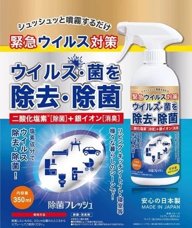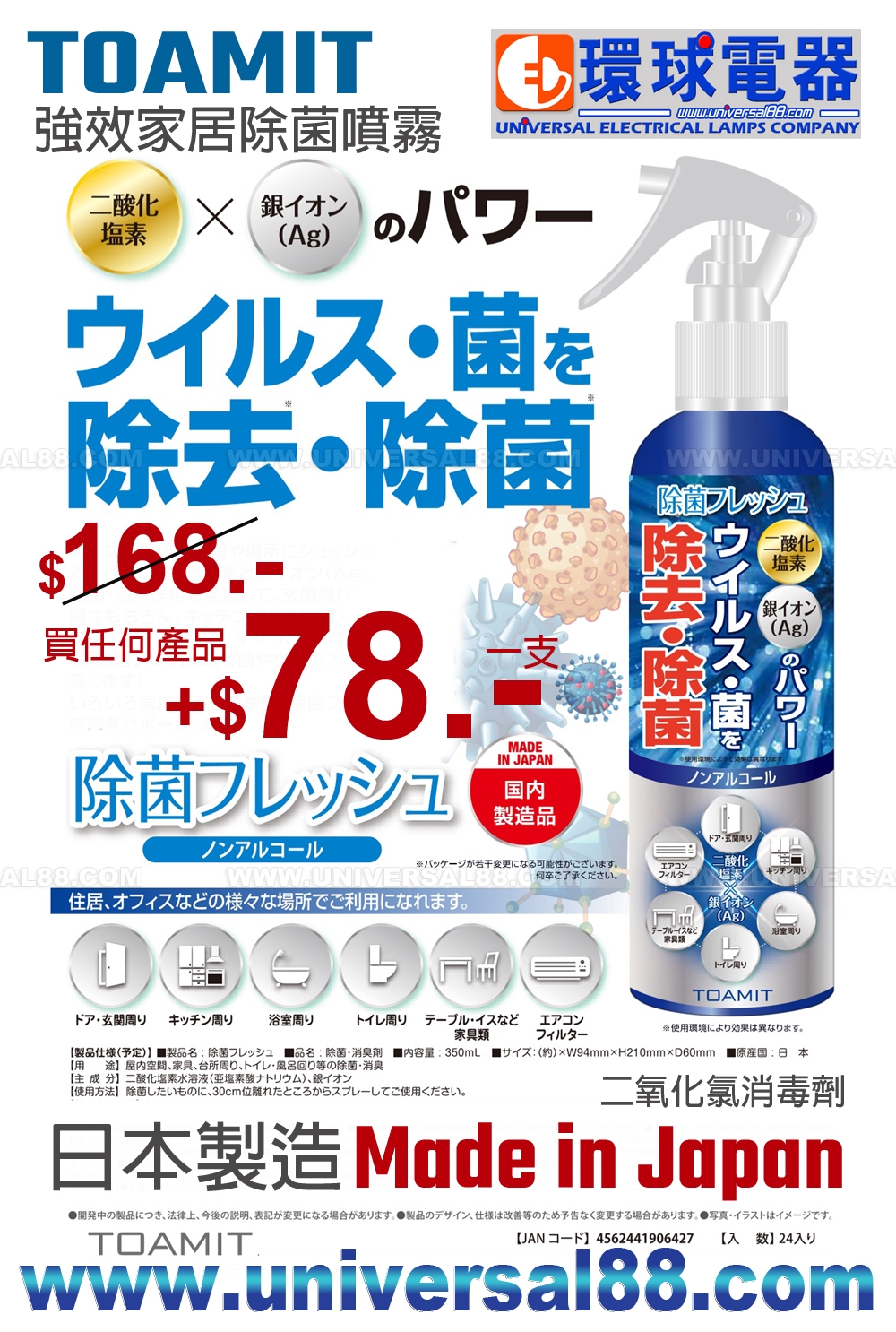 特點: 專利二氧化氯加銀離子配方, 能消滅病源微生物, 細菌, 病毒及除臭等 日本TOAMIT TAO-JF-001 強效家居除菌噴霧 專利二氧化氯加銀離子配方 二氧化氯被世界衛生組織(WHO)定為A1級, 並推薦二氧化氯為「第四代」消毒劑 許多大型醫院與SARS的消毒也都是採用二氧化氯, 其中SARS期間台灣和平醫院及武漢肺炎爆發期間 桃園機場環境消毒工作也是使用二氧化氯為消毒溶液 二氧化氯是屬於氧系列的殺菌劑,比現有氯系殺菌消毒劑 (如漂精、漂水、氯氣等)有更高的殺菌能力, 是它們的2.6~10倍, 能消滅病源微生物、細菌、病毒、 芽孢、真菌等 容量: 350ml 產地: 日本製造(Made in Japan)