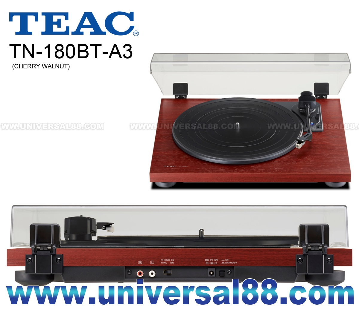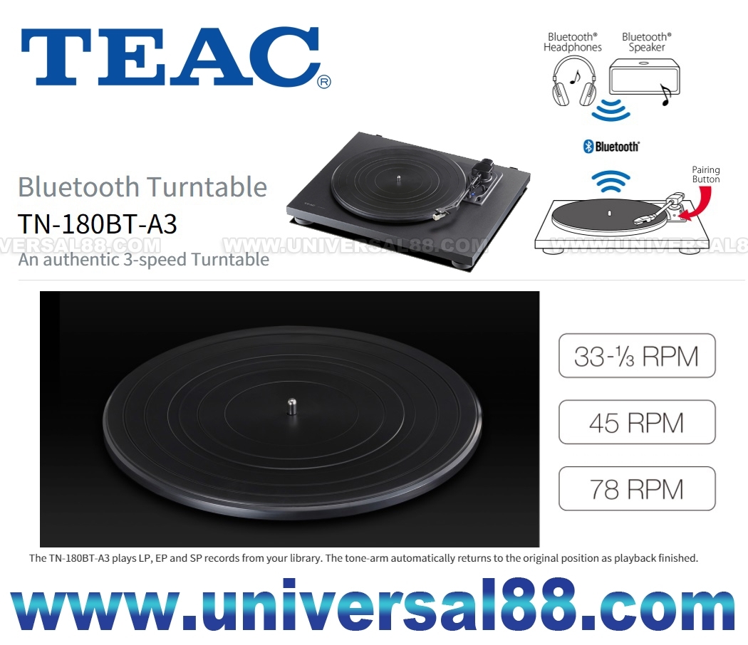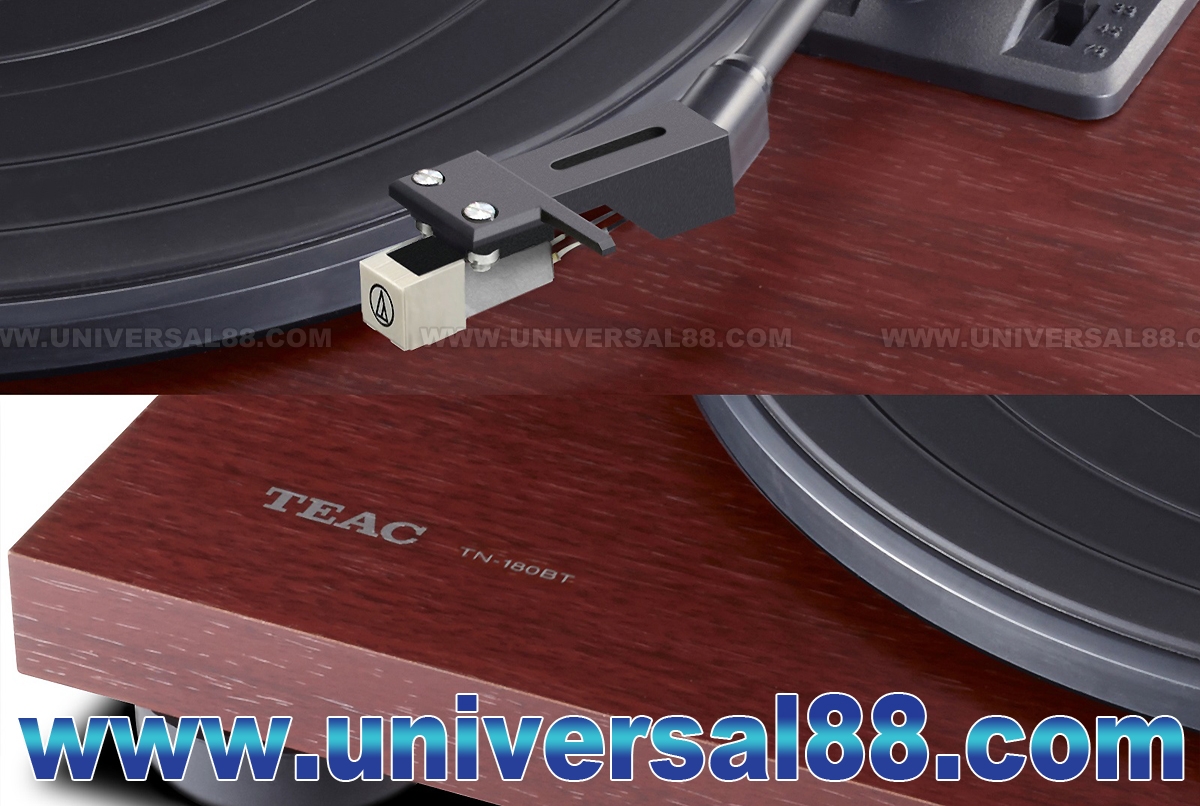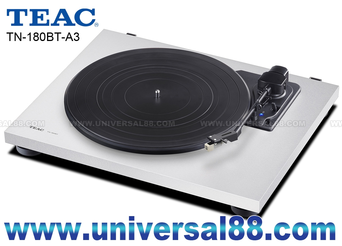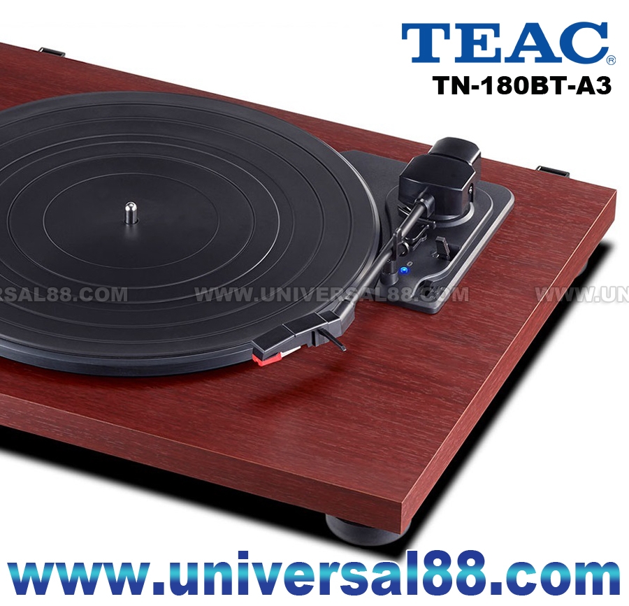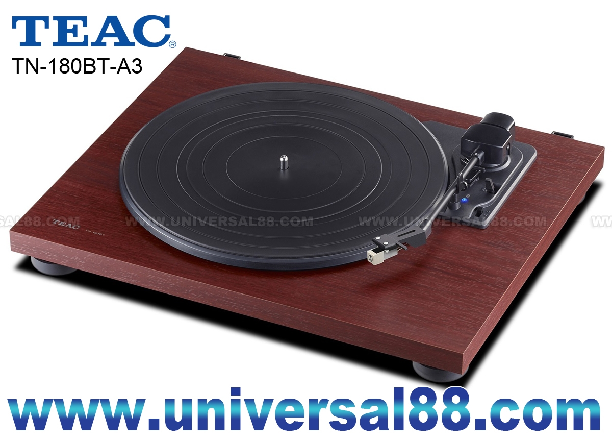 從而獲得了高剛性和良好的阻尼特性 採用Audio-Technica ATN3600L唱頭 提供速度 33-1/3轉 / 45轉以 及78轉 帶動式設計 內置唱頭放大 自動回臂設計 原廠己裝備有MM唱頭, 對入門用家來說, 省郤了配購唱頭 The TN-180BT-A3 brings you a totally new way of listening to vinyl records with its Bluetooth capability. No extra cost for hi-fi components or complicated wiring is required. Only Bluetooth speakers or headphones you might have for iPhones are required to enjoy the world of vinyl records. TEAC TN-180BT Turntable with Bluetooth High-density MDF cabinet construction: Unlike others with plastic chassis, a single wooden board with high-density MDF minimizes vibrations and resonance to playback of your vinyl record library with clearer sound. Built-in MM-type Phono EQ amplifier: Enjoy vinyl playback with any amplifier regdless type of inputs. The TN-180BT supports both PHONO and LINE outputs that allow you to play vinyl with or without Phono equalizer Authentic belt-drive turntable: The plastic platter is driven by a high torque DC motor, while precision stainless steel spindle and durable brass spindle holder maintain accurate DC Motor Belt-drive turntable Built-in Bluetooth transmitter to BT speakers or headphones Built-in Phono equalizing amplifier PHONO, LINE and Bluetooth outputs High-density MDF cabinet for improved resonance reduction AT3600L ny audio-technica 3-speed (33-1/3, 45, 78 rpm) Auto-return and manual arm lifter Sleek design in cherry finish EQ amplifier: On / Off 1組RCA音頻輸出 電壓: 100~240V 50/60Hz 1.5W Standby 0.2W 尺寸: W420 / H105 / D356 mm 4.9 kg (主機尺寸) 尺寸: W*** / H*** / D*** mm** kg (包裝尺寸) 總量: 4.9 kg (Weight) 顏色: 木色(Cherry Walnut)