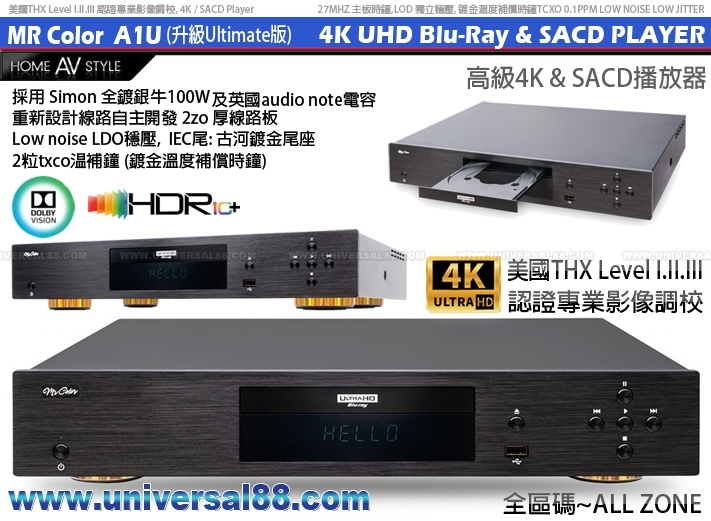 特點: 全區碼播放, 美國THX Level I.II.III 認證專業影像調校, 4K / SACD Player